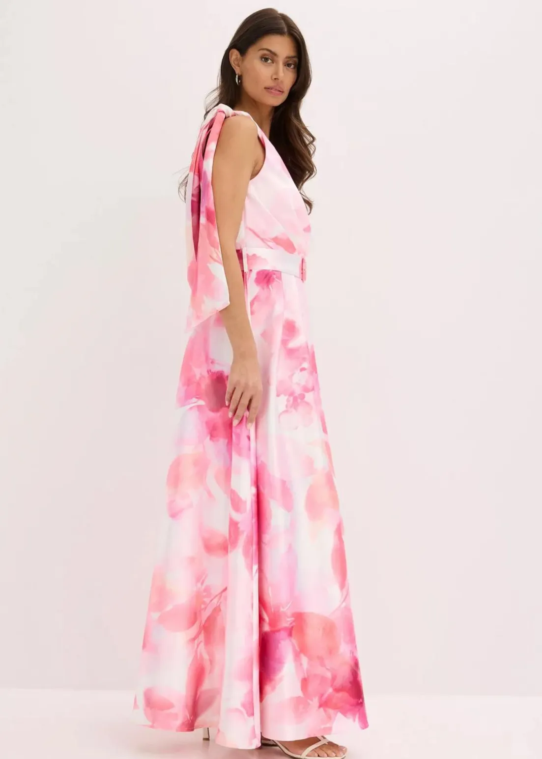 Modern und femin: One-Shoulder-Kleid in Maxi-Länge aus glänzendem Satin mit Allover-Print, womit es jedes Teil zu einem Unikat macht.
