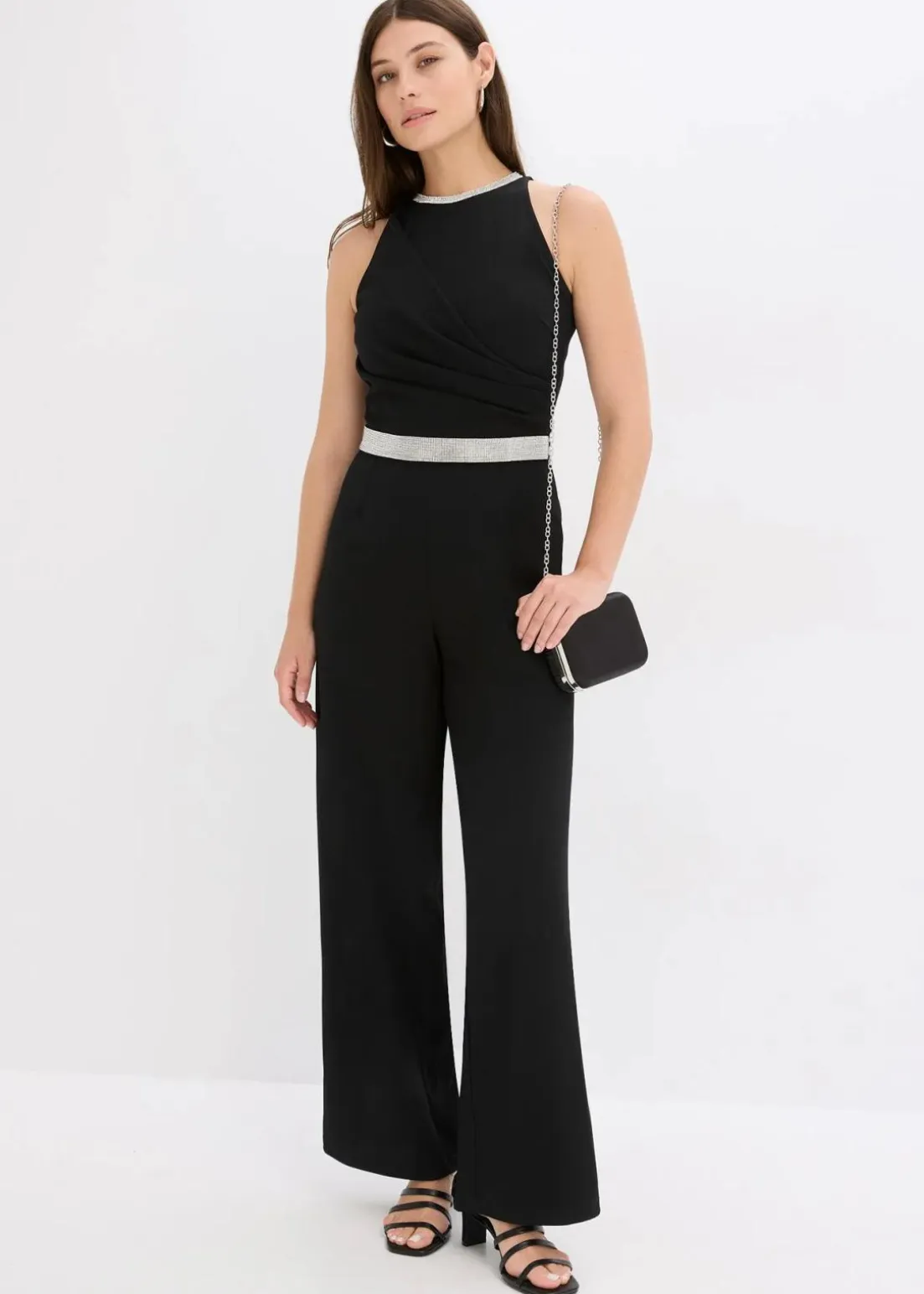 Modern und feminin: Overall aus strukturiertem Crepe mit Strassstein-Besatz am Ausschnitt und an der Taille