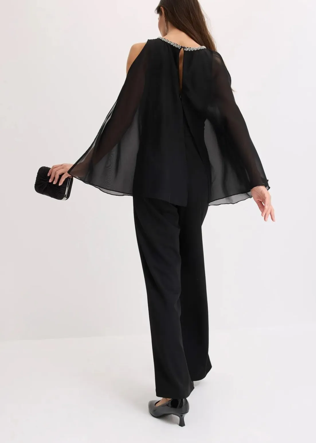 Modern und feminin: Overall aus strukturiertem Crepe mit kaschierendem Überwurf aus feinem Chiffon und Strasssteinverzierungen am Ausschnitt