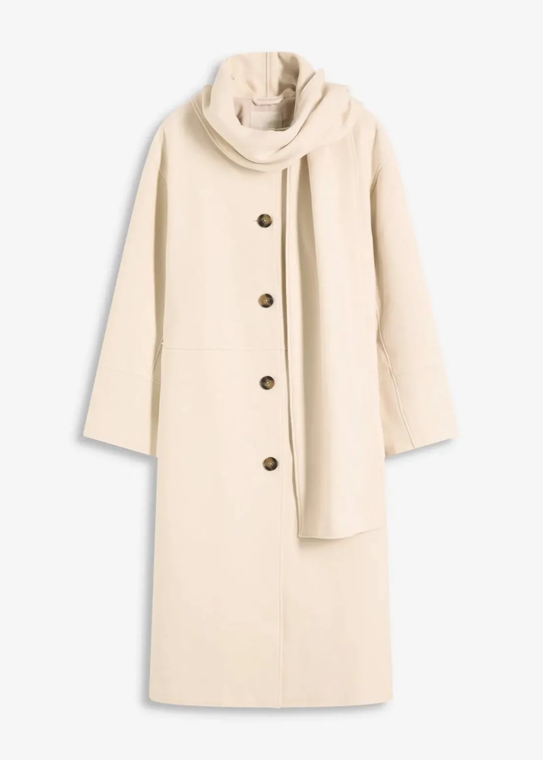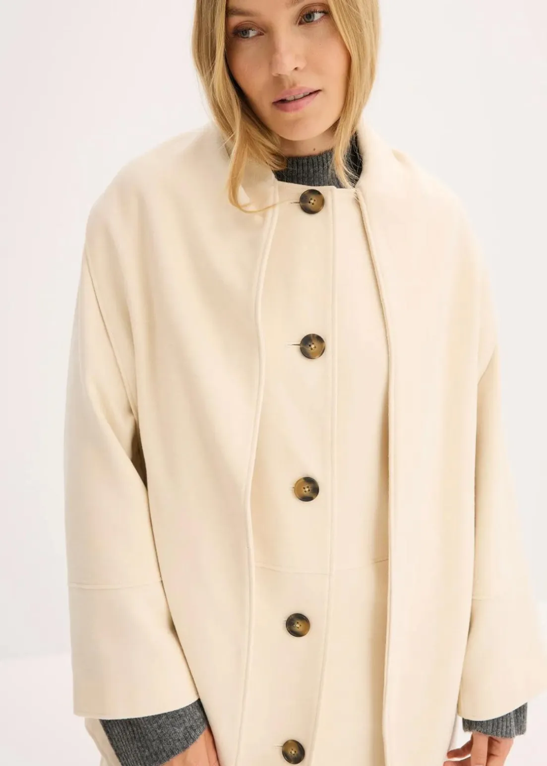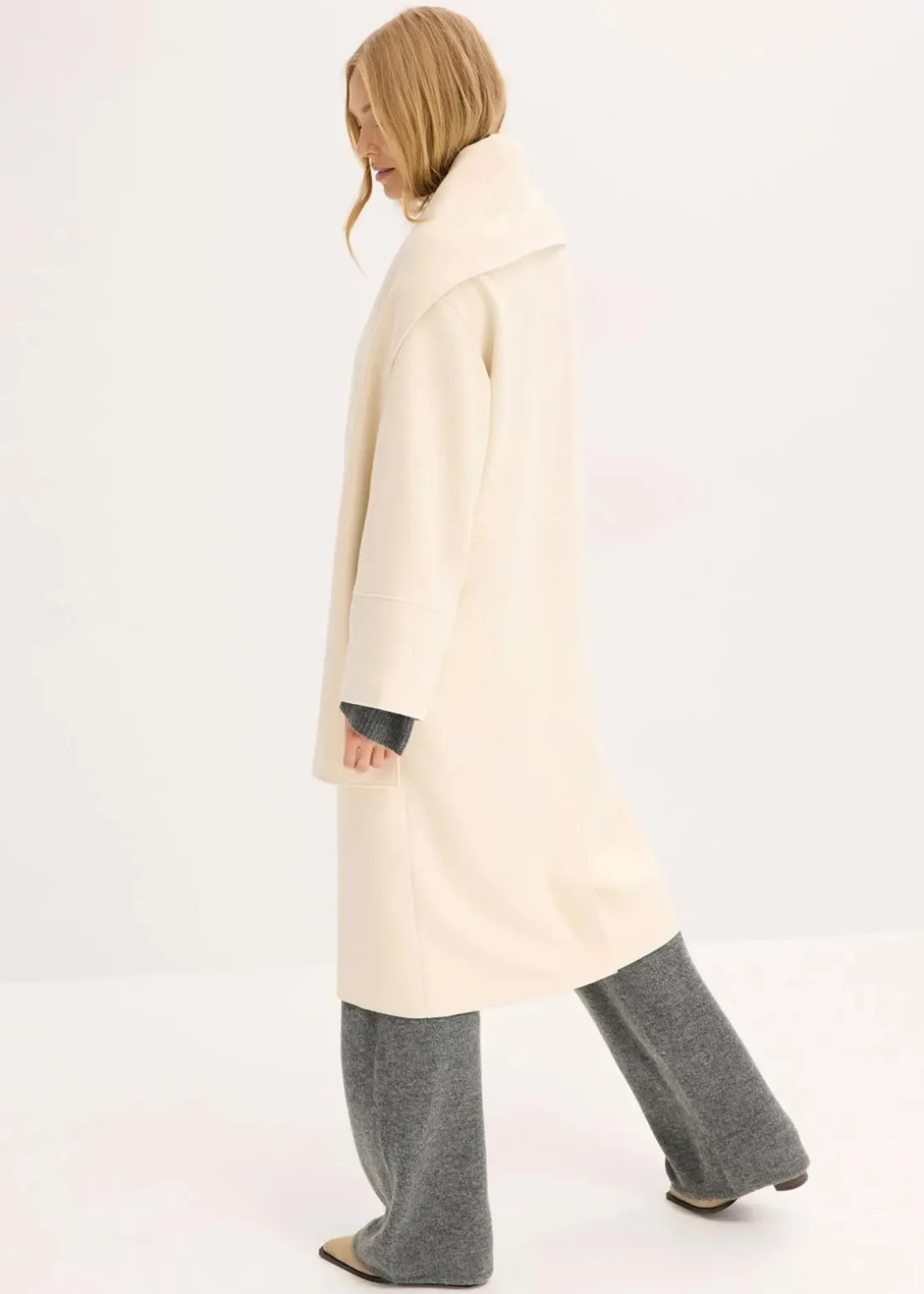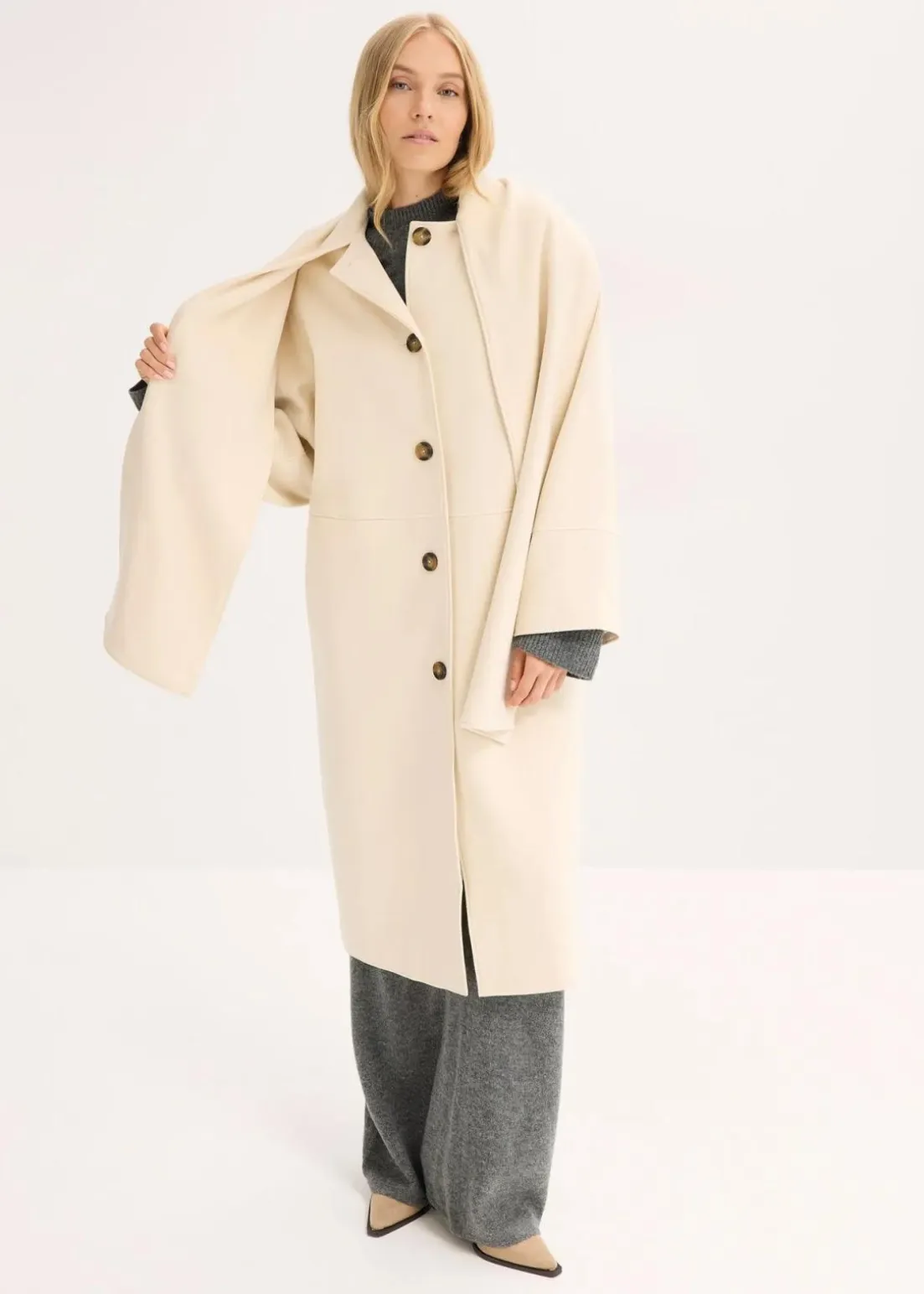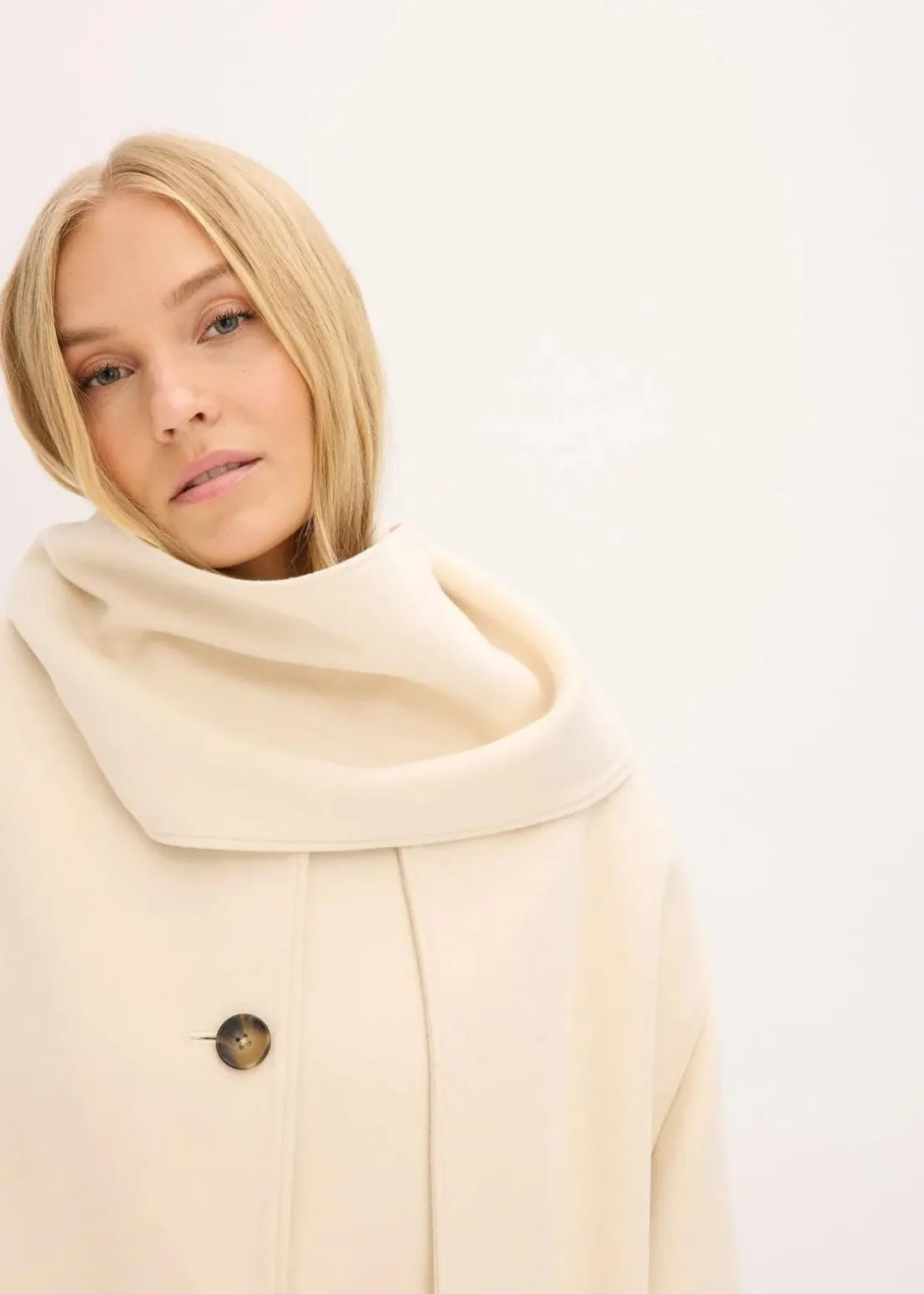 Langer Oversize-Mantel mit Schaldetail sowie langen weiten Ärmeln. Vorne mit zwei dezenten Nahttaschen, welche aus Qualitätsgründen bei Lieferung geschlossen sind. Diese können bei Bedarf aufgetrennt werden.