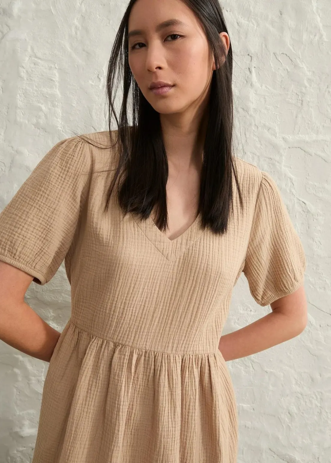 Weites Baumwollkleid mit streckendem V-Ausschnitt