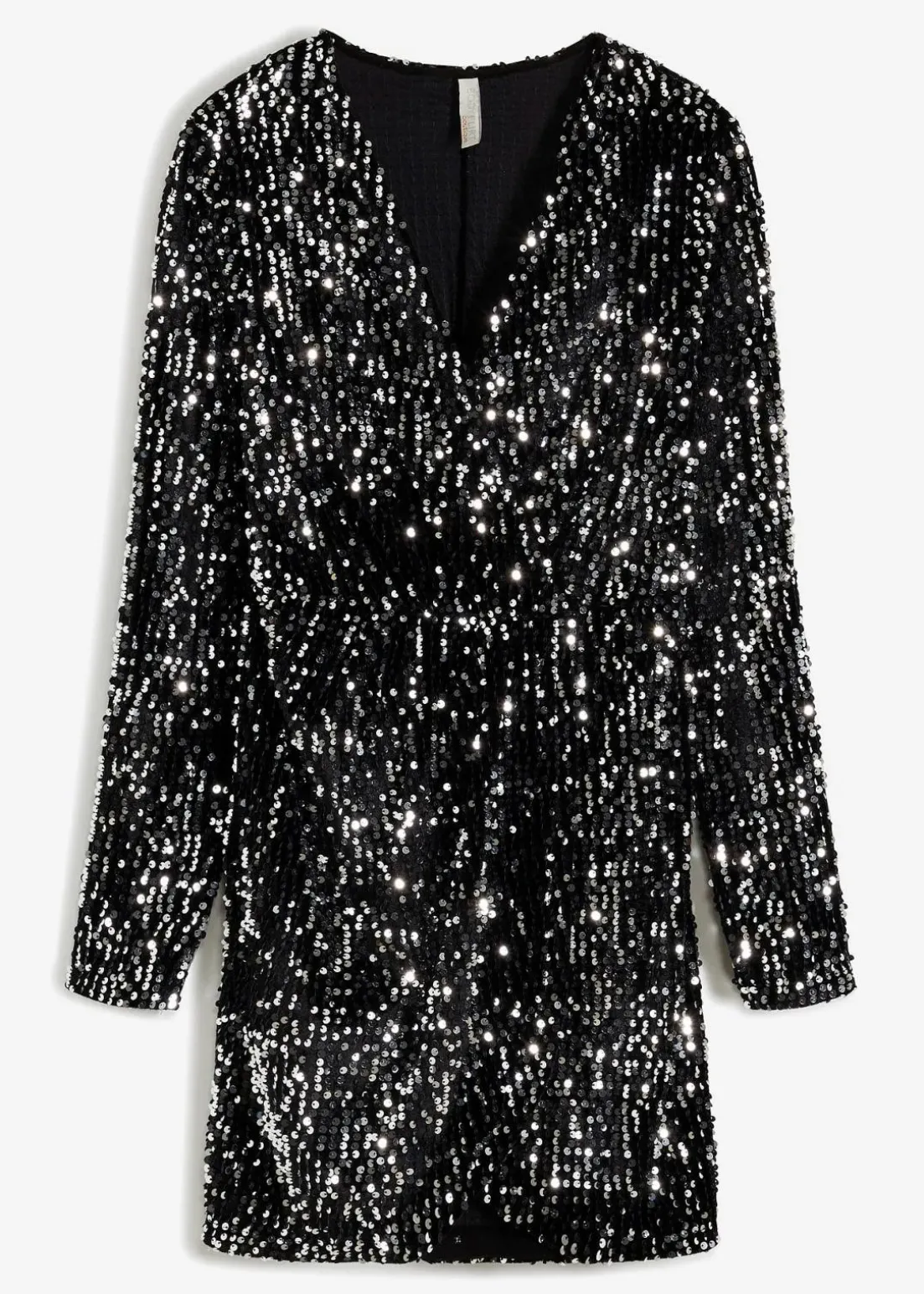 Modern und feminin: Samtkleid mit Pailletten in Wickeloptik und mit Raffungen.