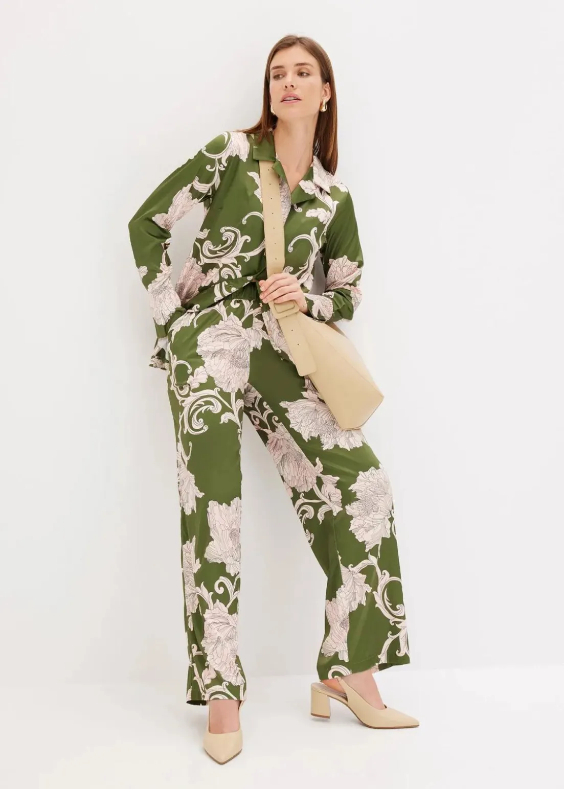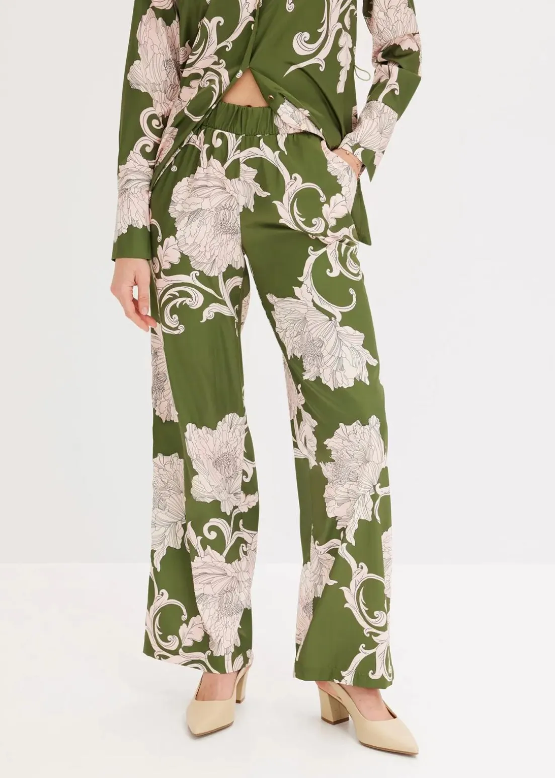 modisch bedruckte Palazzo-Hose aus fließendem Satin mit weitem Bein.