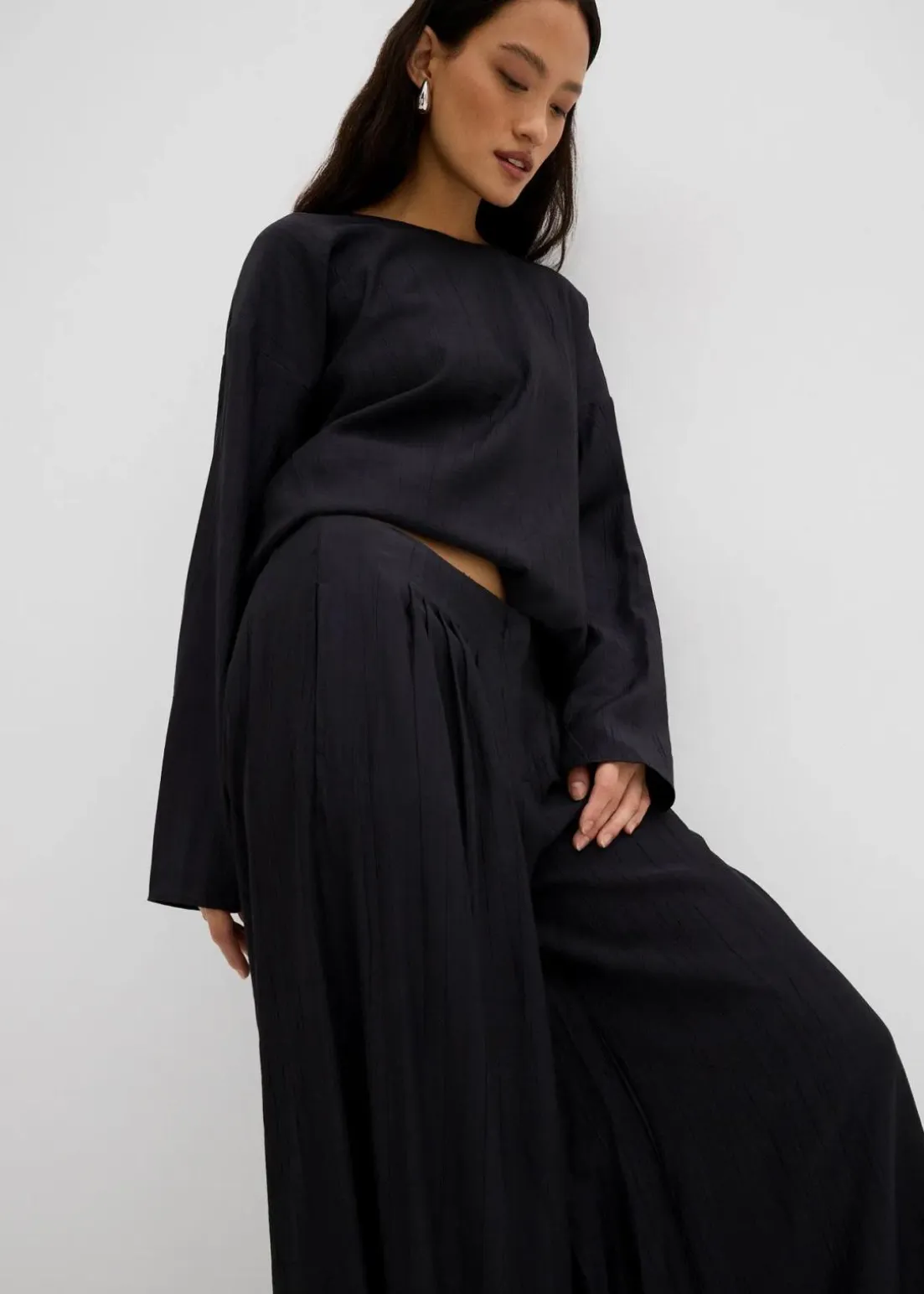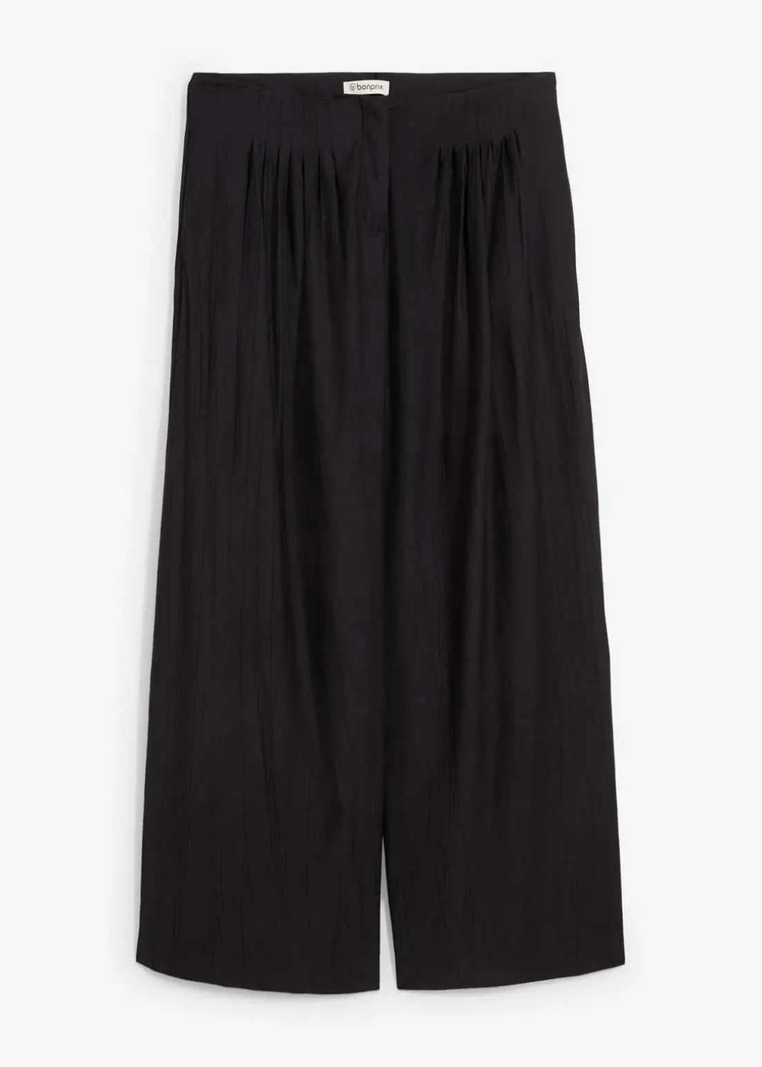 Palazzo-Hose mit zwei Seitentaschen vorne und zwei Paspeltaschen hinten sowie Abnähern an der Vorderseite.