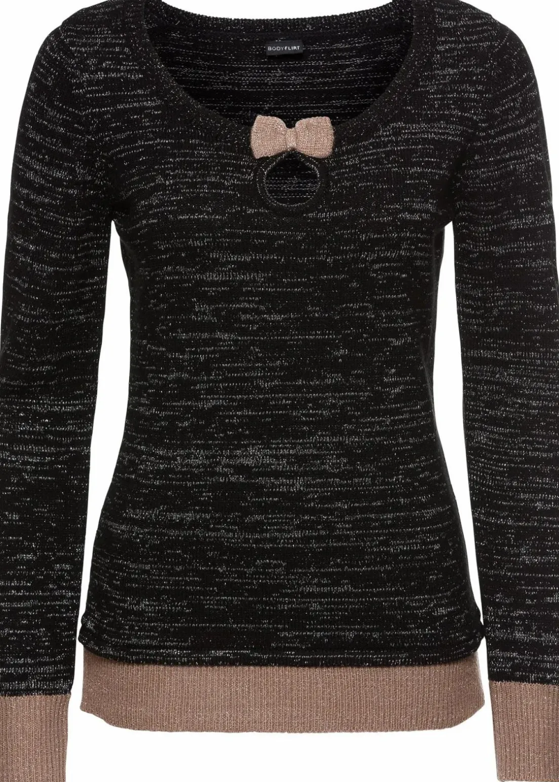 Dieser ausgefallene Strickpullover aus der aktuellen Kollektion von BODYFLIRT präsentiert sich als perfektes Outfit für die selbstbewusste Frau.Mit seinen metallisierenden Fasern sorgt der feminine Strickpullover für einen wahrhaft glänzenden Auftritt. Der ungewöhnliche Ausschnitt betont auf sehr attraktive Weise das Dekolleté. Zu den raffinierten Details des Pullovers gehören auch der jeweils farblich abgesetzte Armabschluss und Bund sowie die schöne Schleife am Ausschnitt.