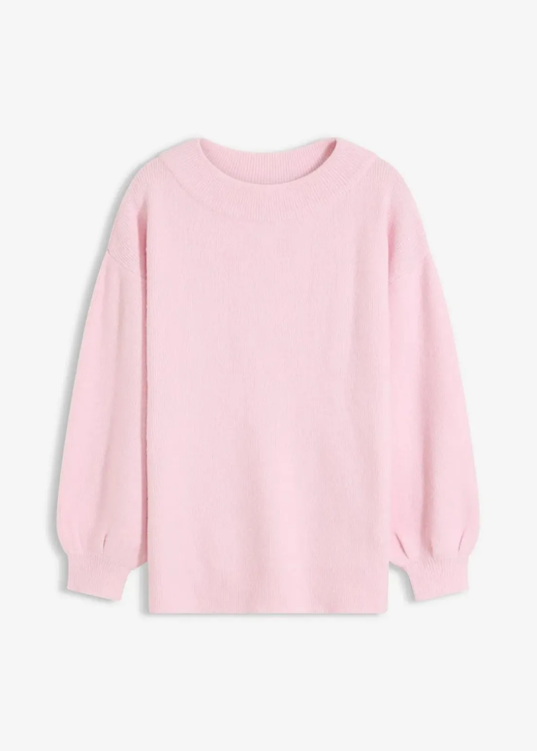 Attraktiver Strickpullover mit hochgeschlossenem Rundhalsausschnitt und modernen Ballonärmeln