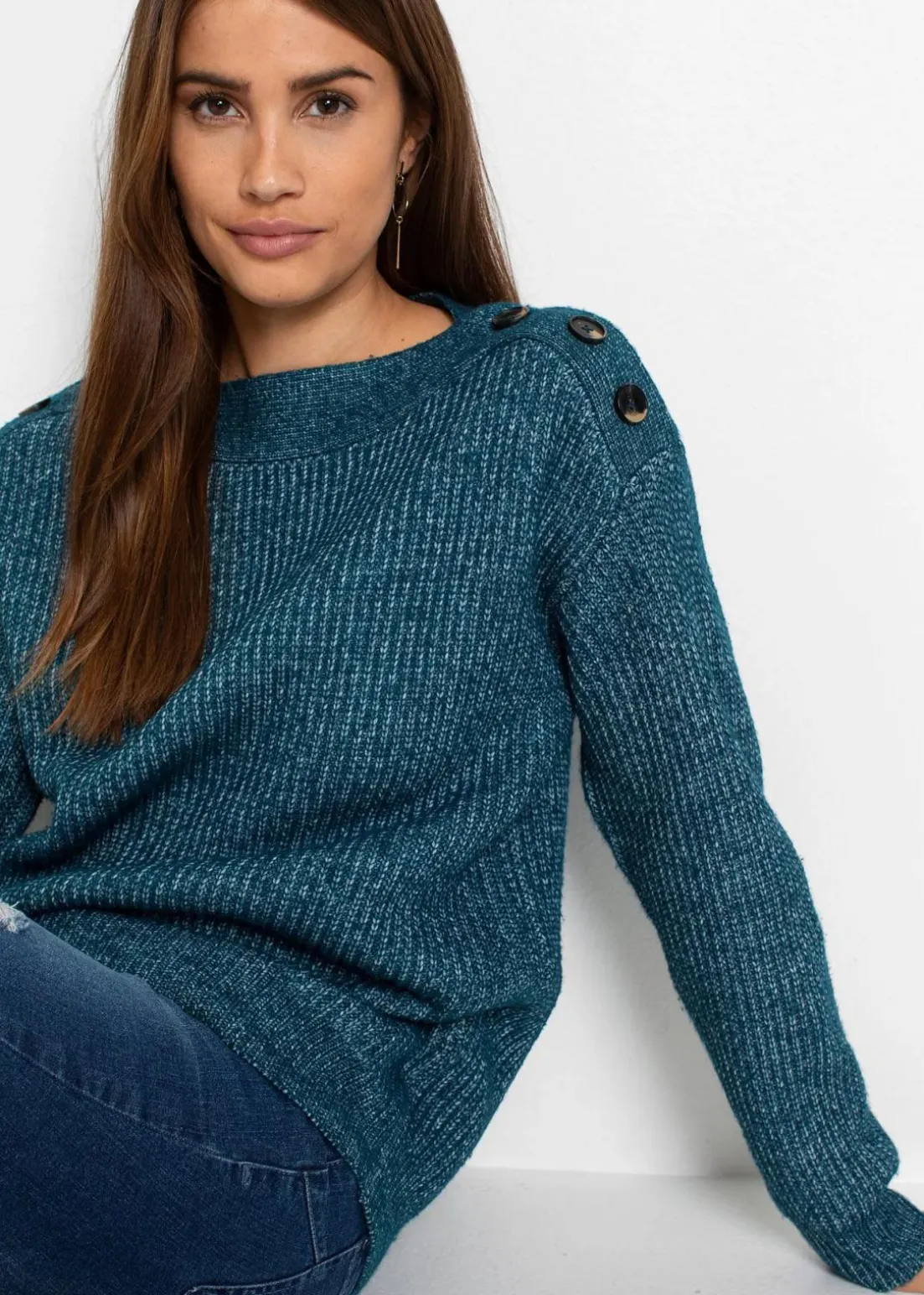 Schöner Pullover mit Knöpfen von Bodyflirt. Der Pullover hat einen U-Boot Ausschnitt, der am Ende mit Knöpfen verziert ist. Optische Länge bei Gr. 36/38 ca. 64cm.
