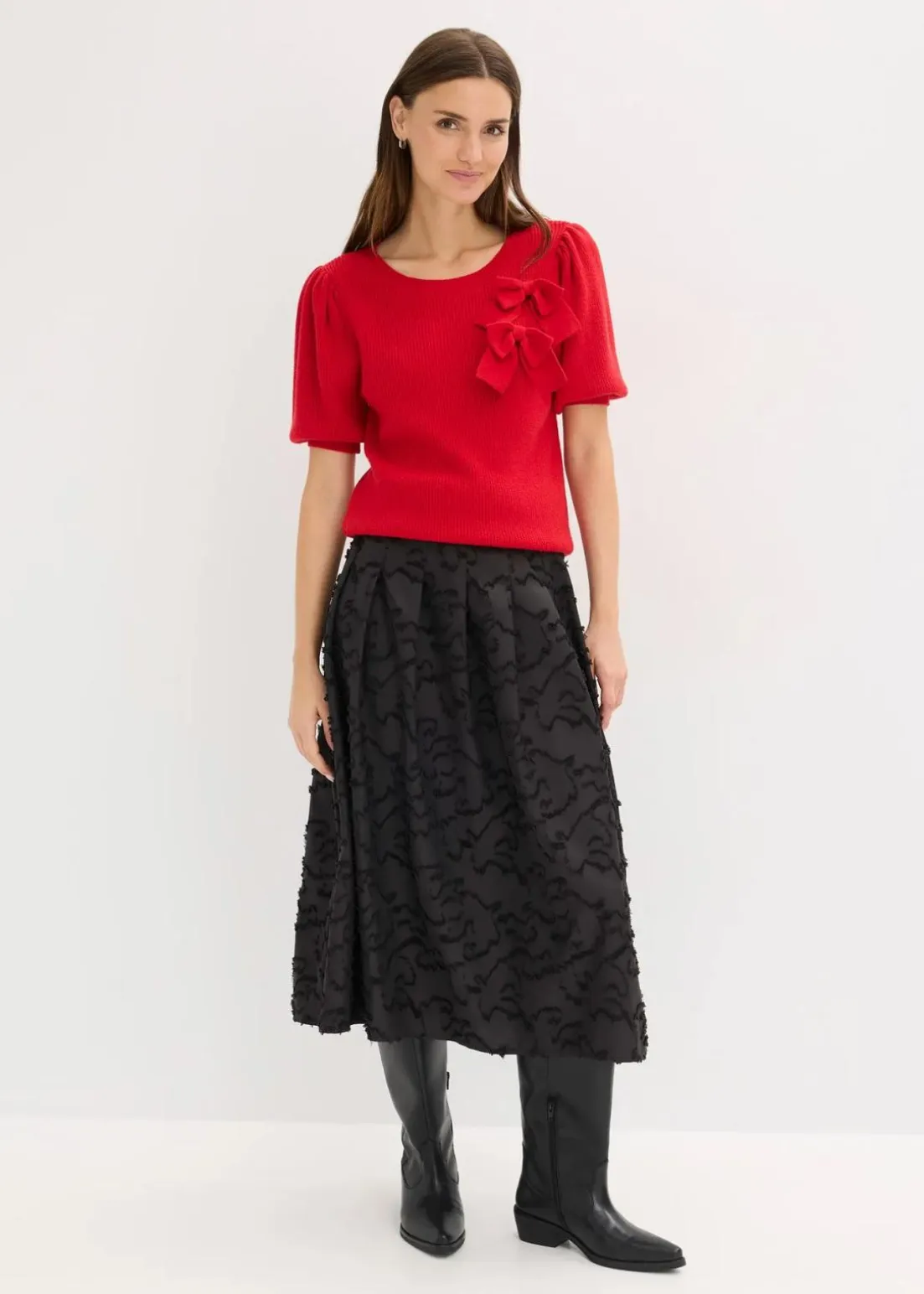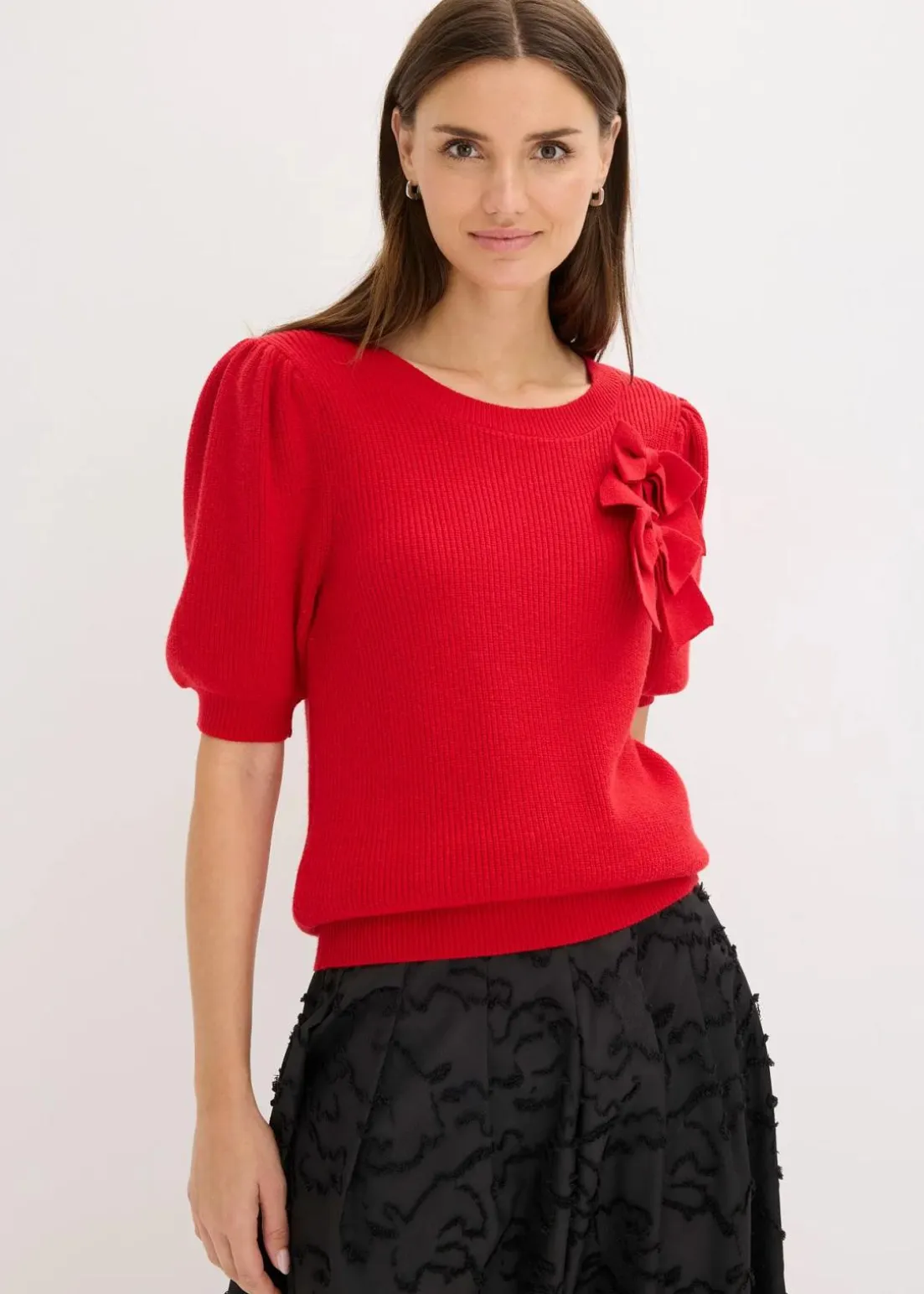 modischer Pullover mit Puffärmeln und dekorativer Schleifen-Applikation vorne