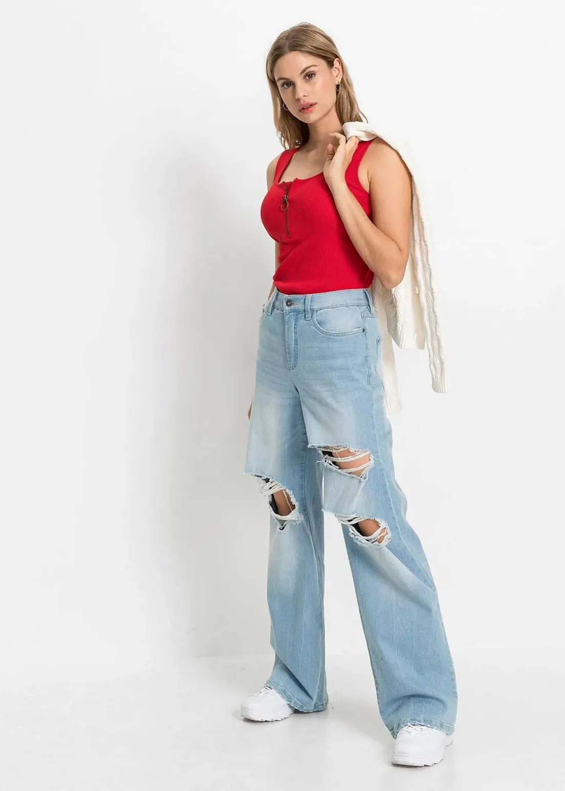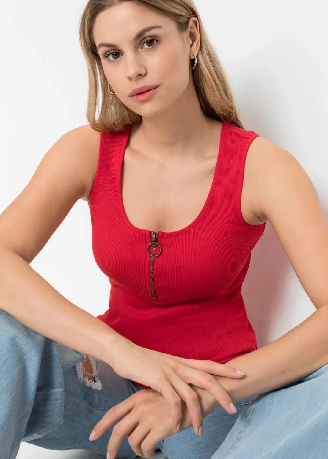 Sportiv präsentiert sich dieses lässige Top aus reiner Baumwolle. Das weiche Oberteil punktet mit einer angesagten Rippstruktur und einem sehr tiefen Rundhalsausschnitt. Der setzt sich mit einem raffinierten Zipper trendig in Szene und lässt sich noch weiter öffnen. Zu kurzen Hosen und Röcken sieht das legere Ripp-Top mit Reißverschluss prima aus.