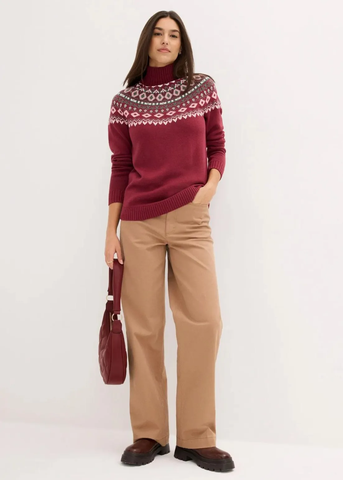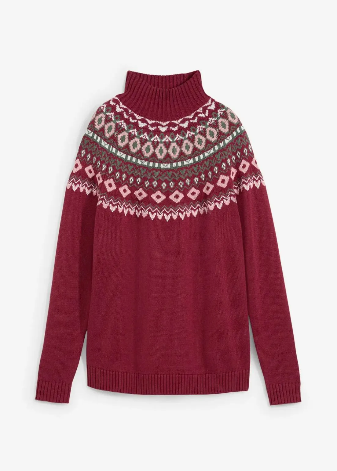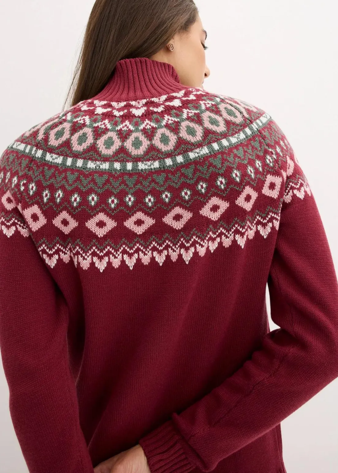 Kuscheliger Strickpullover mit Norwegermuster und Schalkragen