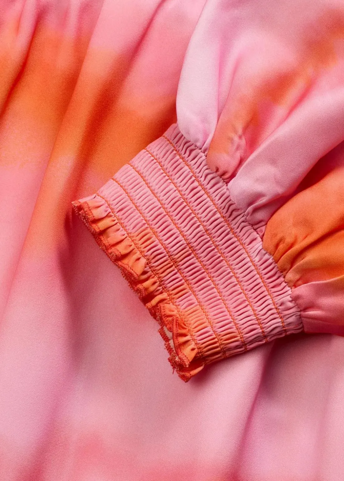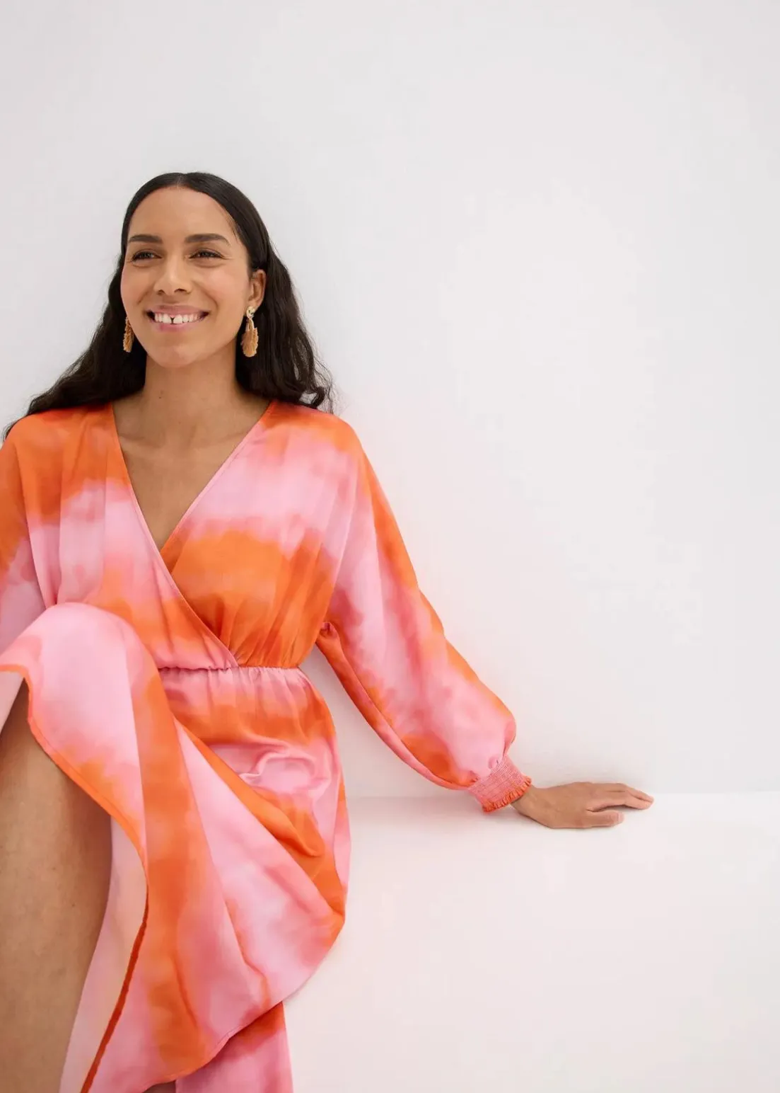 bedrucktes Midikleid auf fließendem Satin mit sommerlichem batik-Print und weit geschnittenen Ärmeln