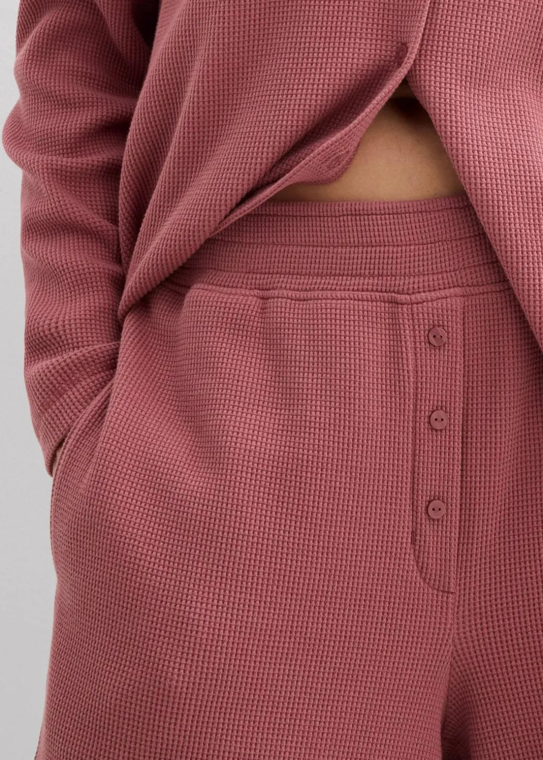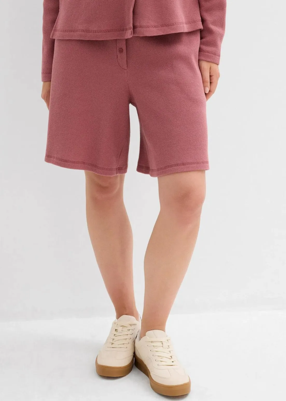 Shorts aus strukturiertem Waffle-Jersey. Schlupfstil mit elastischem Bund und Zierknöpfen.