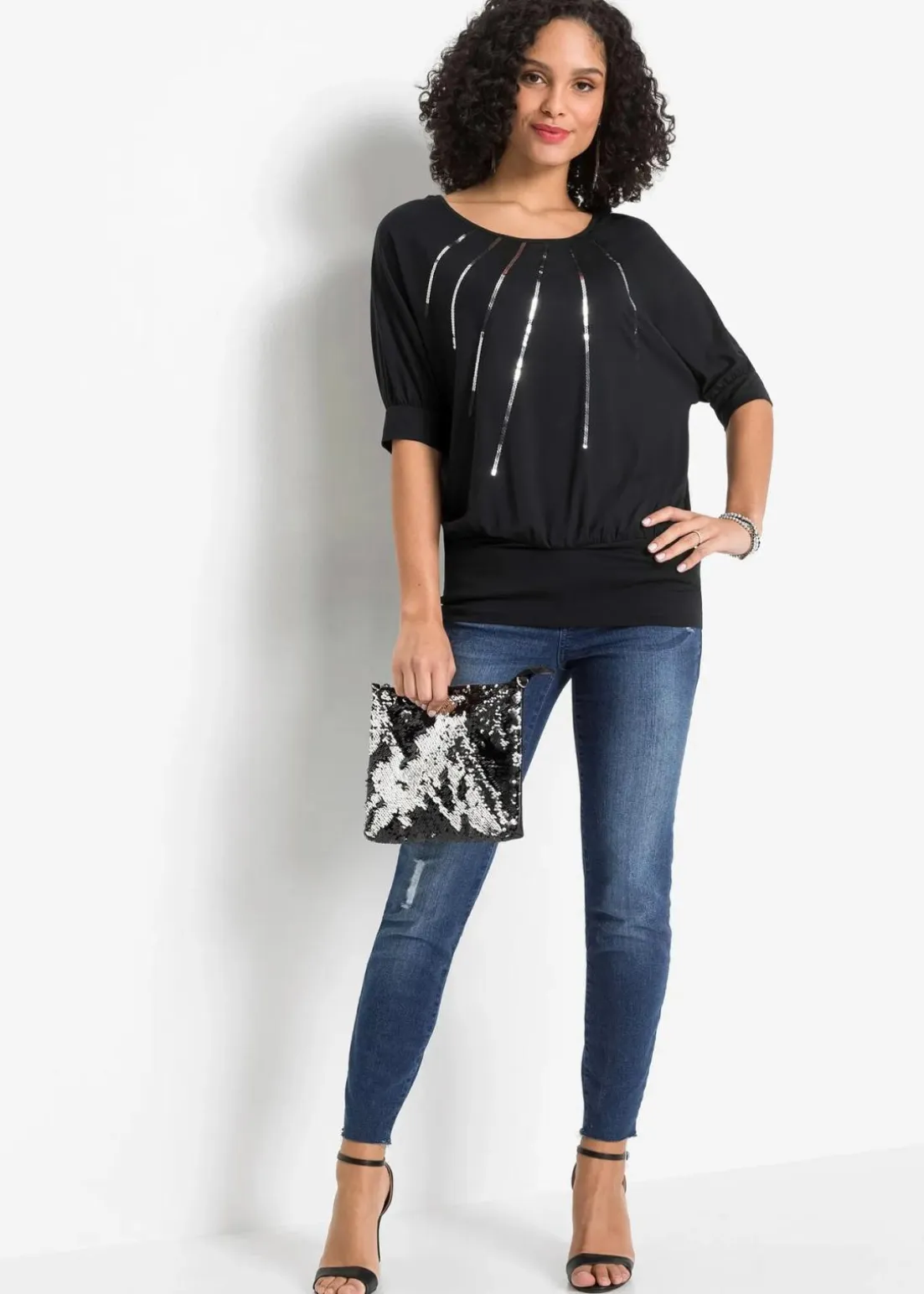 Raffiniertes Shirt mit Paillettenverzierung und besonderer Schnittform
