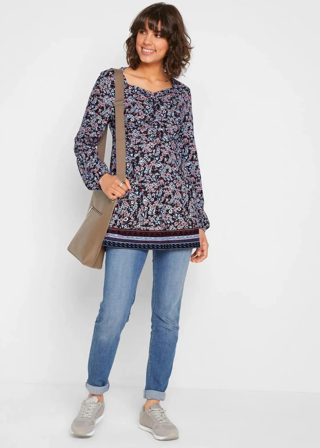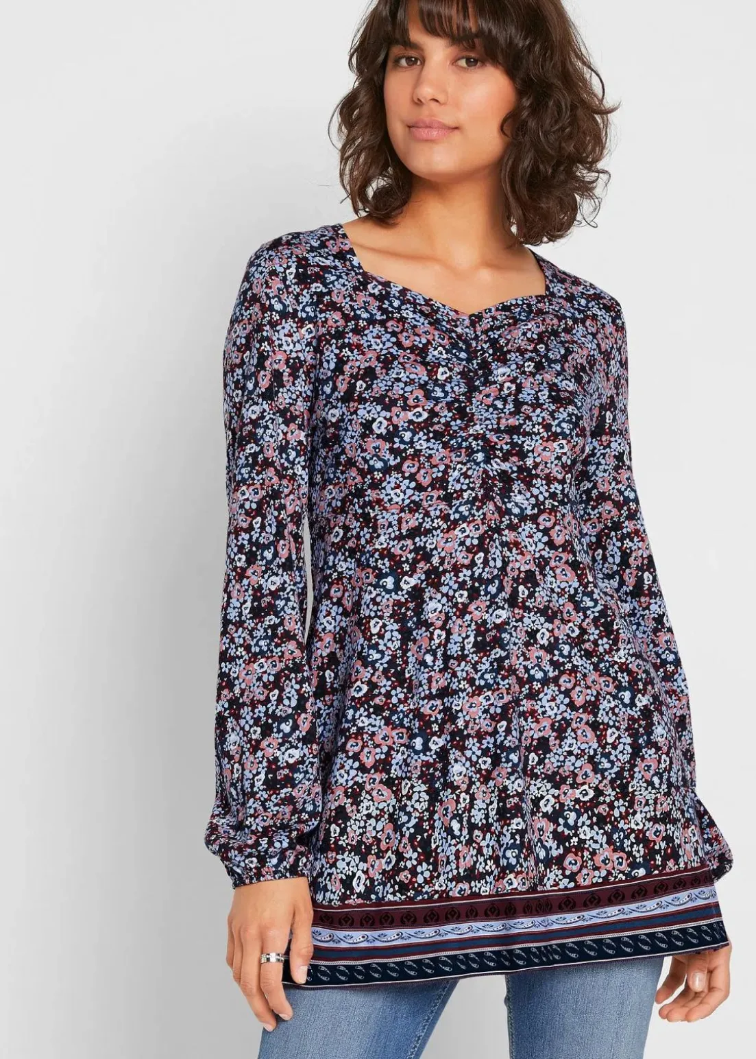 Geblümtes Jerseyshirt umspielt die A-Linie durch Raffung unter der Brust