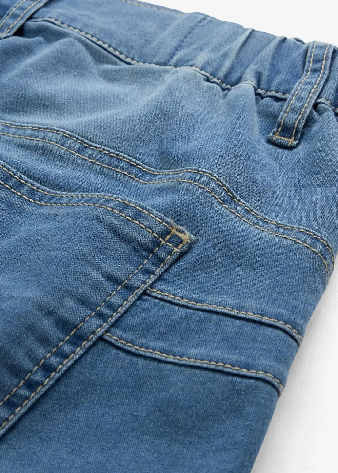 5-Pocket Jeans mit hohem Bund mit seitlichem Gummizug und zwei Knöpfen. Auf der Rückseite schräg verlaufenden Seitennähte für einen Push-Up-Effekt. Dünnes sehr elastischen Material.