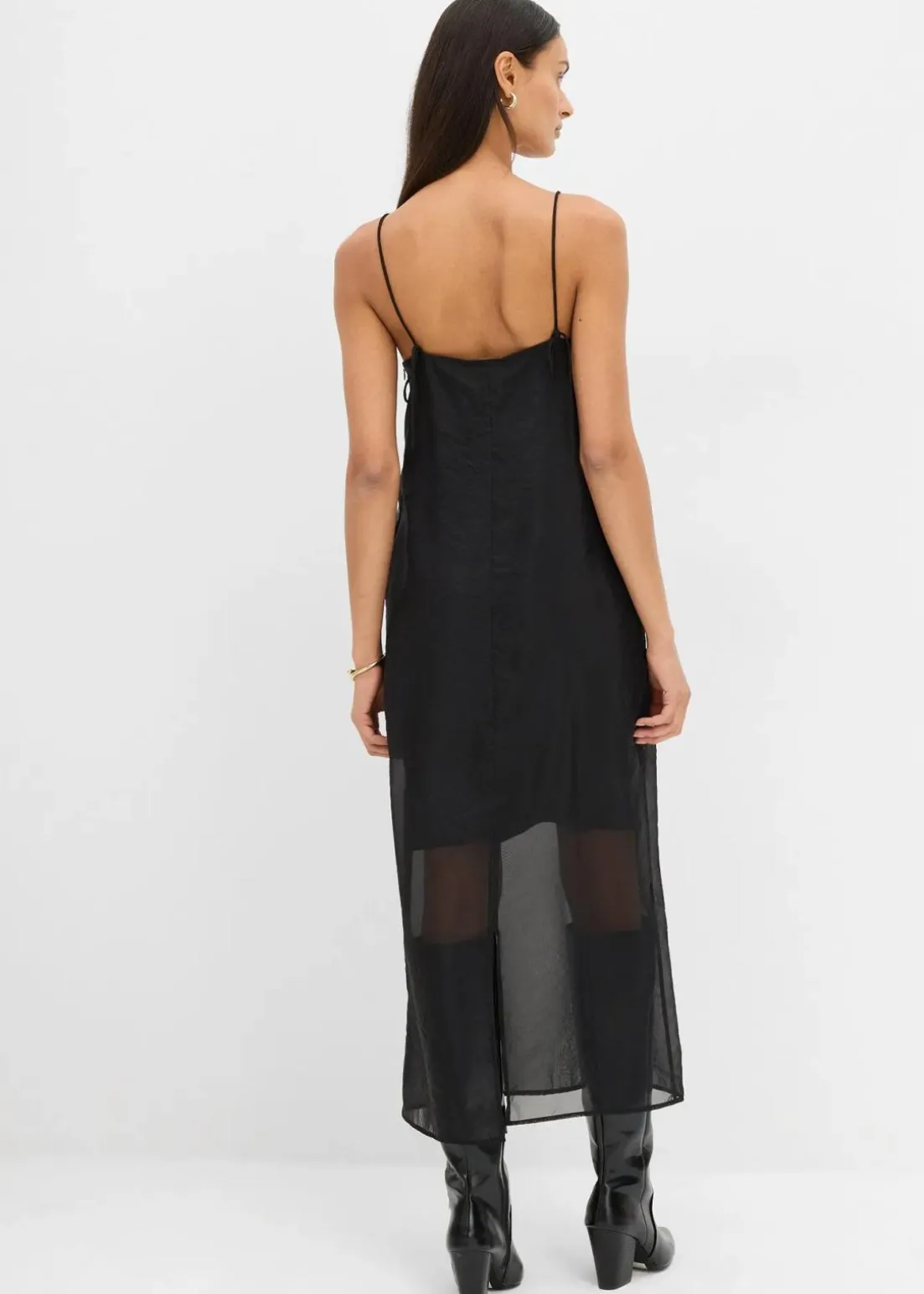 Maxikleid mit Spaghettiträgern im Materialmix mit transparentem Oberkleid