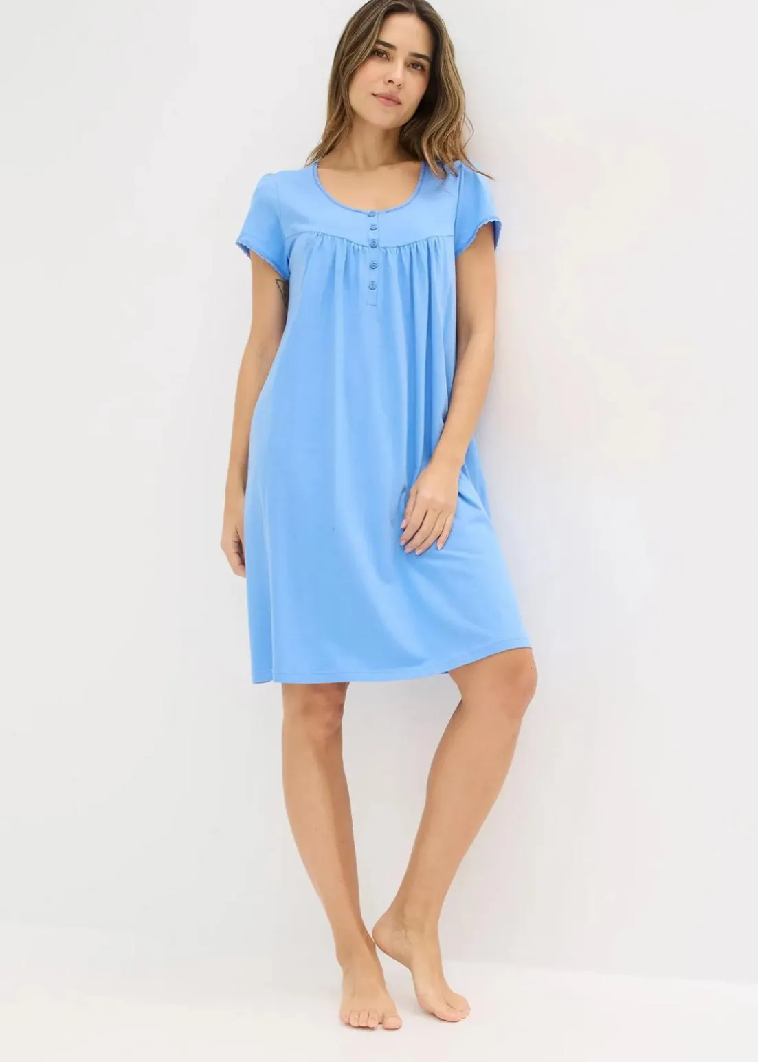 Das Schwangerschaftsnachthemd ist praktische Nachtwäsche mit dem Gewissen Etwas. Raffinierte Details wie die Raffungen im vorderen Bereich und das schmale Spitzenband an Ausschnitt und Armen machen das schöne Umstandsnachthemd zu einem echten Lieblingsteil.Die weiche Baumwollqualität und der figurumspielende Schnitt sorgen für hohen Tragekomfort. Dank der kleinen Knopfleiste ist das Nachthemd auch für das spätere Stillen sehr komfortabel.
