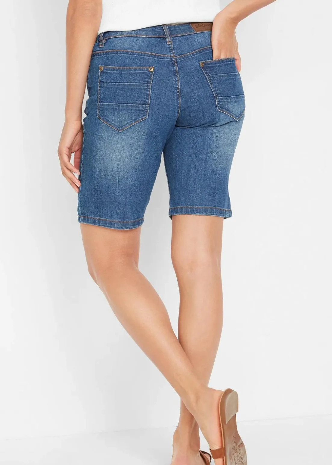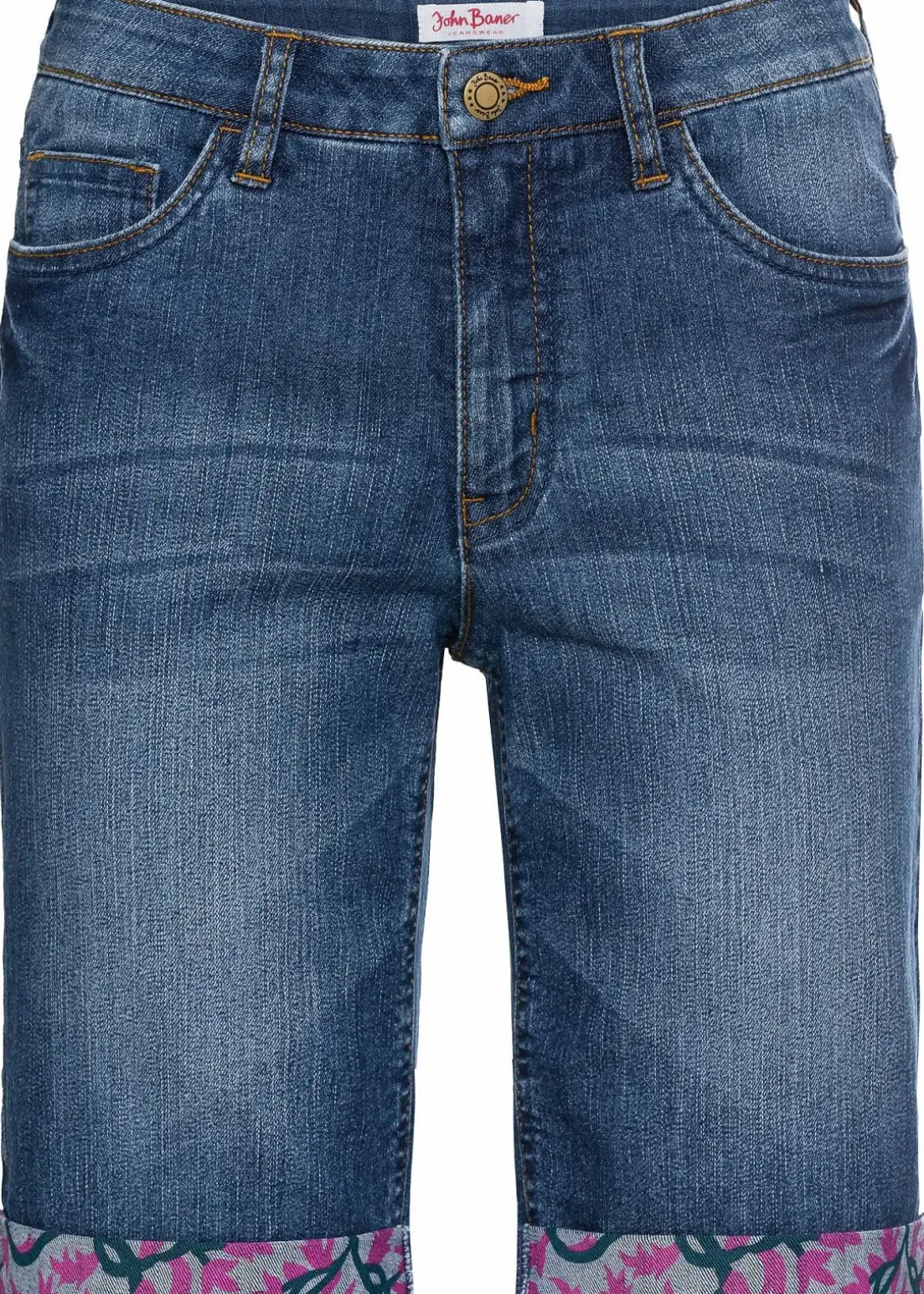 Ein gerader Schnitt und die körpernahe Passform sorgen bei dieser Stretch-Jeans-Bermuda mit farbigem Umschlag für einen wunderbaren Sitz. Das Modell im typischen 5-Pocket-Design präsentiert sich mit einer leichten Waschung. Das kontraststarke Saumende setzt einen attraktiven Akzent. Die Stretch-Jeans-Bermuda mit farbigem Umschlag von John Baner sieht mit einem gerippten Tanktop und Sneakern sehr lässig aus. Etwas femininer wirkt sie mit einem floral bedruckten T-Shirt oder einer leichten Tunika und Espadrilles.