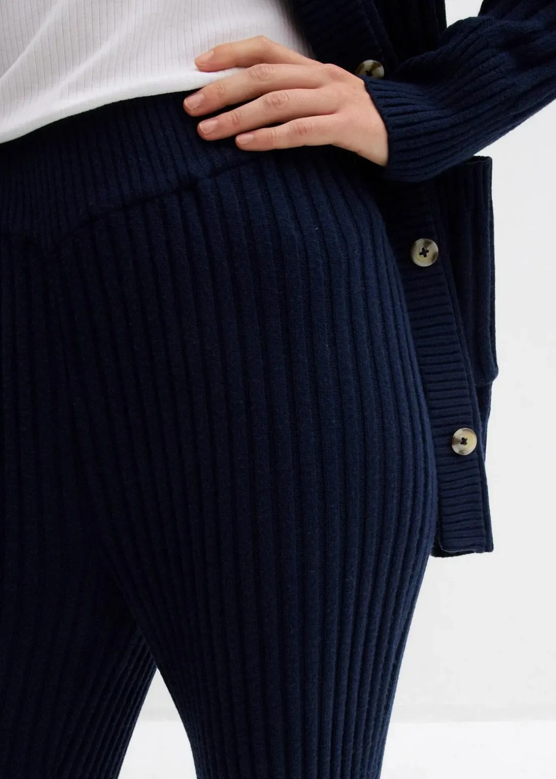 Hoch tailliertes Hosenmodell mit schmalen Rippbund und verdecktem Gummizug.