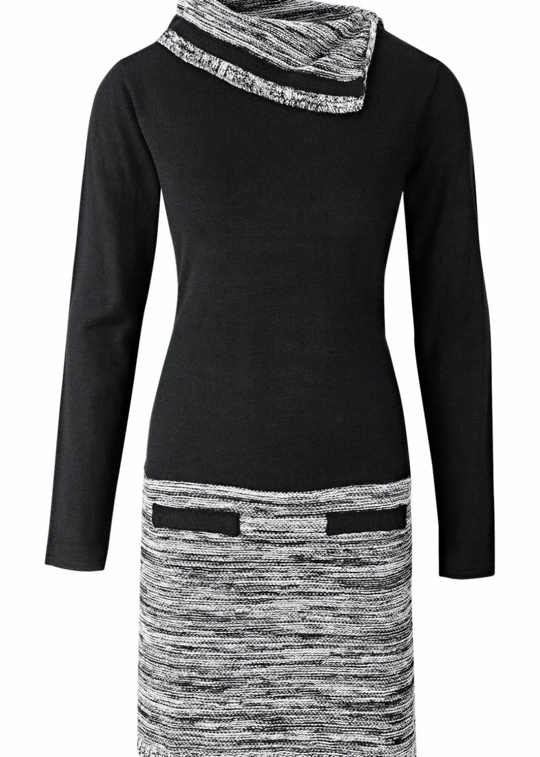 Durch den zweifarbigen Look erscheint das hübsche Strickkleid wie ein Zweiteiler aus Rock und Oberteil. Während der Rockteil meliert ist, ist das Oberteil eher schlicht gehalten.Hingucker des figurbetonenden Kleids ist der angesagte Turtleneck-Kragen, der ebenfalls mit einer melierten Optik punktet. Schicke Overknees oder Stiefel machen den femininen Style perfekt.