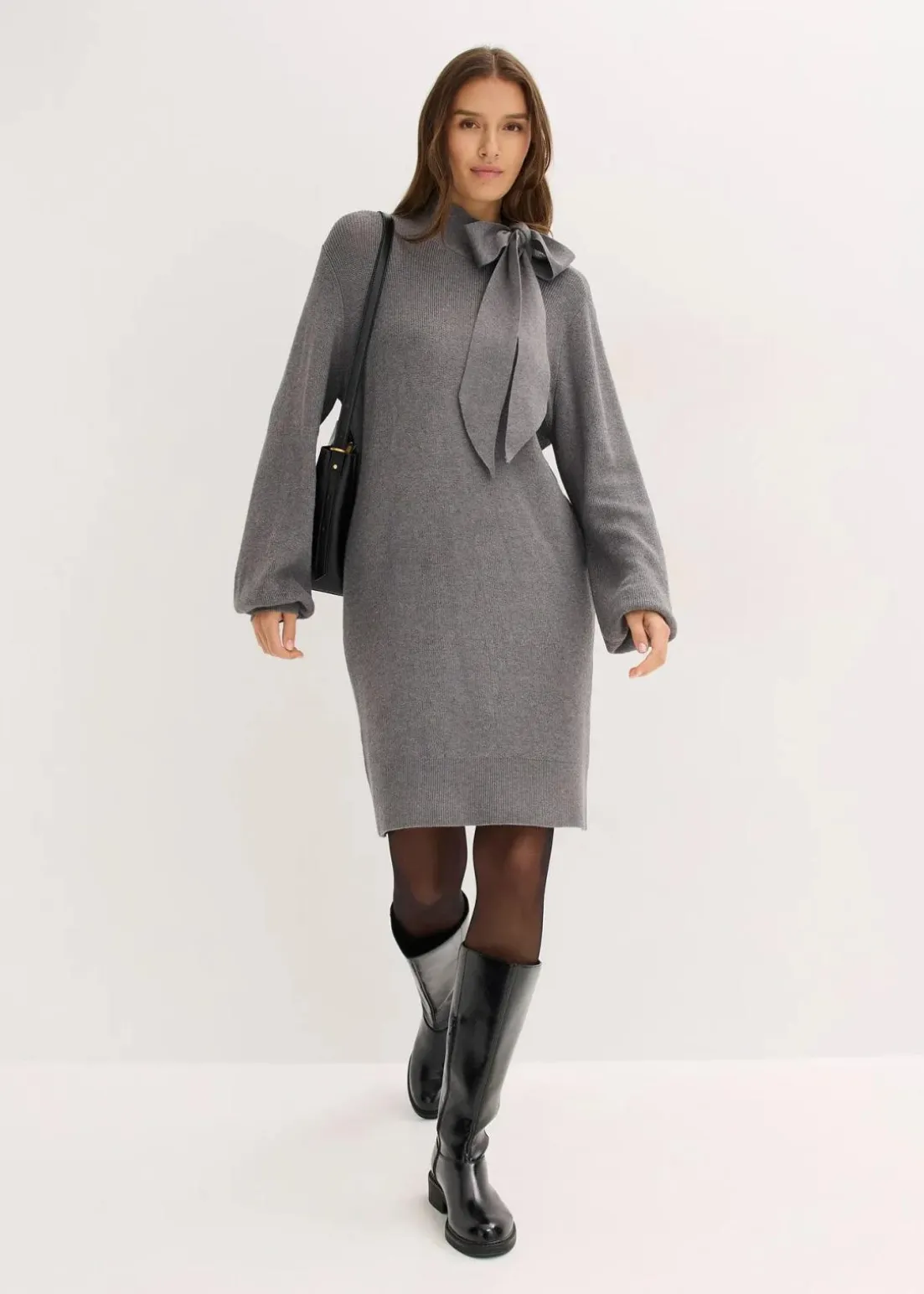 kurzes Strickkleid mit dekorativer Schleife seitlich am Kragen
