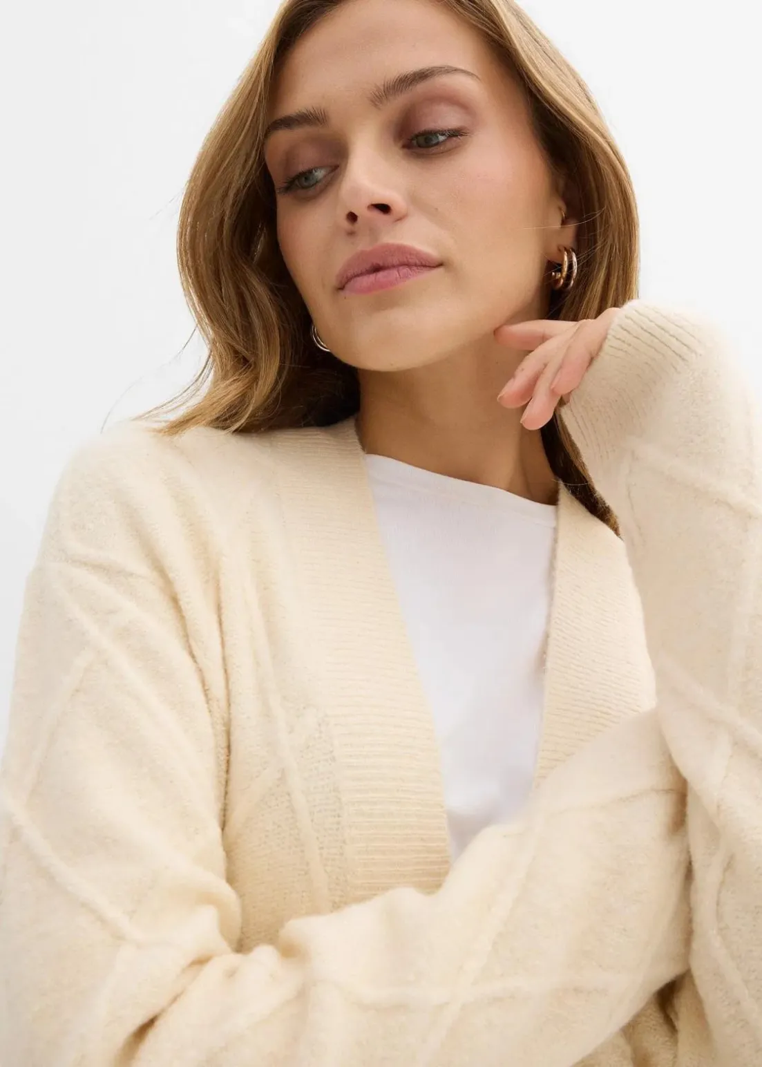 Langer Strickmantel aus Zopfstrick. Modell mit überschnittenen Schultern und Bindegürtel.