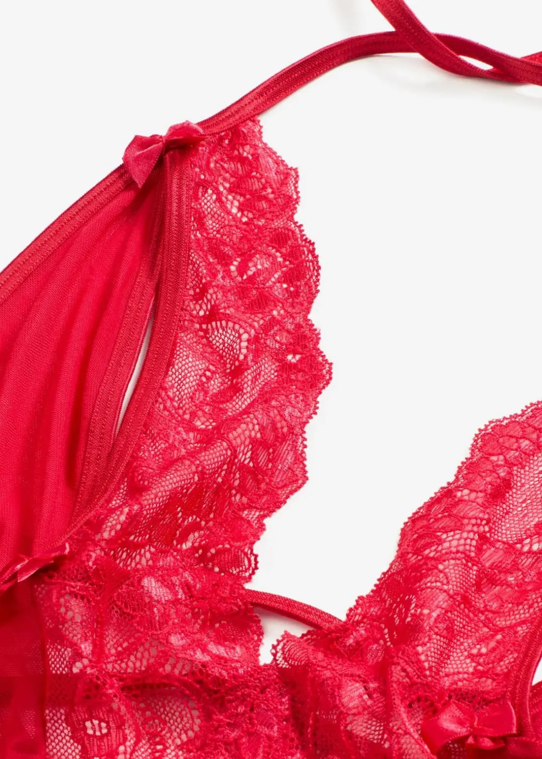 Mit diesem unwiderstehlichen Stringbody mit Neckholder zeigen Sie viel Haut und bereiten Ihrem Partner eine reizvolle Überraschung.Der knapp geschnittene Stringbody aus transparenter Grundware gewährt tiefe Einblicke. Die Öffnungen an den Cups und im Schritt verleihen eine aufregende Optik. Der verführerische Spitzeneinsatz und die verspielten Satinschleifen in Kontrastfarbe machen das erotische Design komplett.