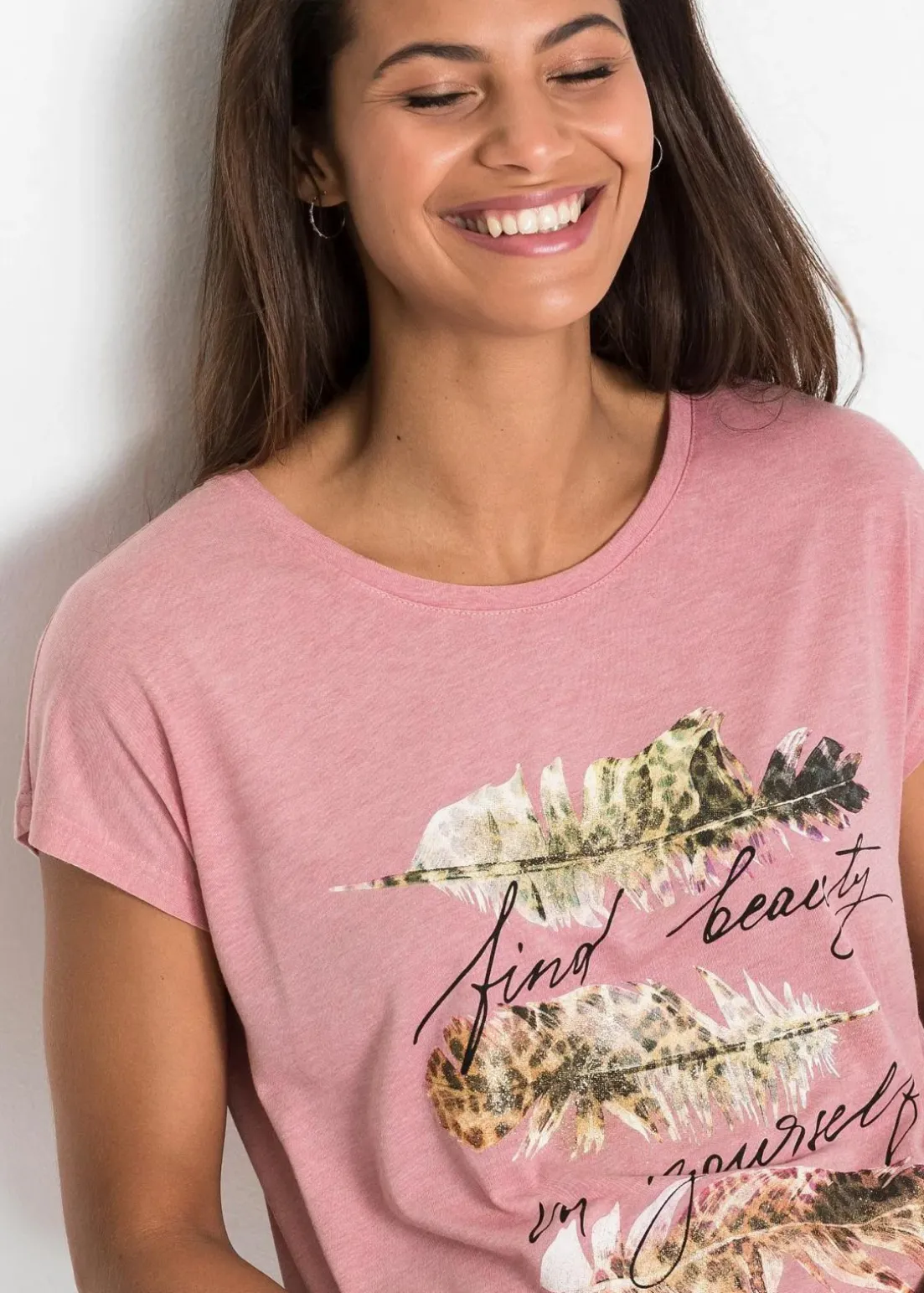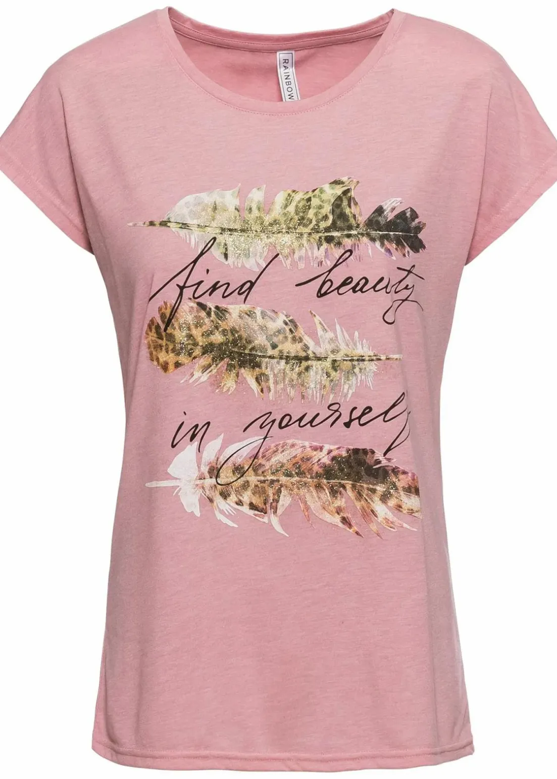 Mit einem verschnörkelten Schriftzug und großen, glänzenden Motivdrucken überzeugt dieses coole Shirt im Boho-Style. Das hochmodische Rundhals-Modell präsentiert sich mit kurzen Flügelärmeln. Es reicht bis zur Hüfte und sitzt locker am Körper. Das angesagte T-Shirt mit Glitzerdruck lässt sich toll zu Jeanshosen oder Chinos sowie zu Strickjacken und Blousons kombinieren.