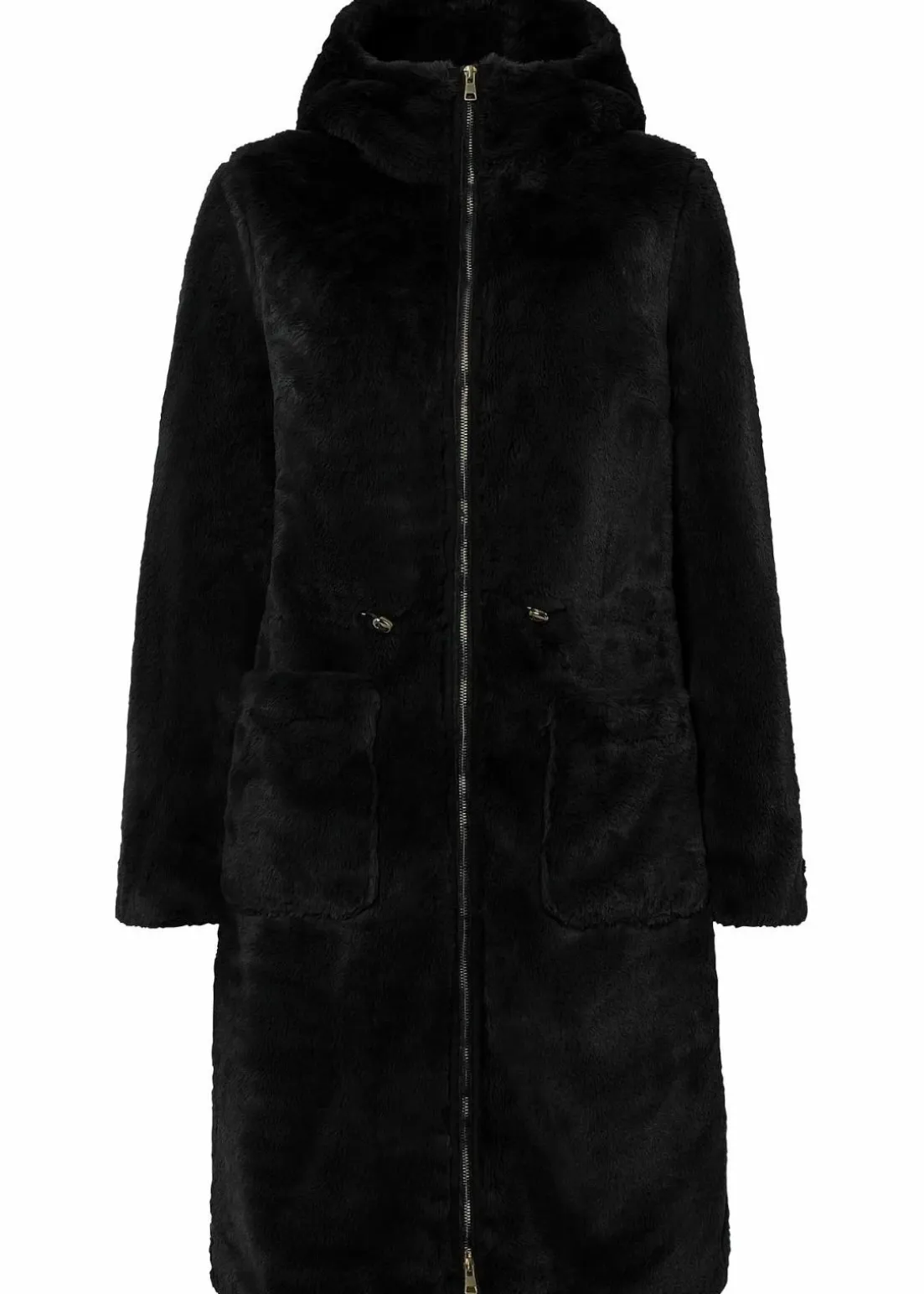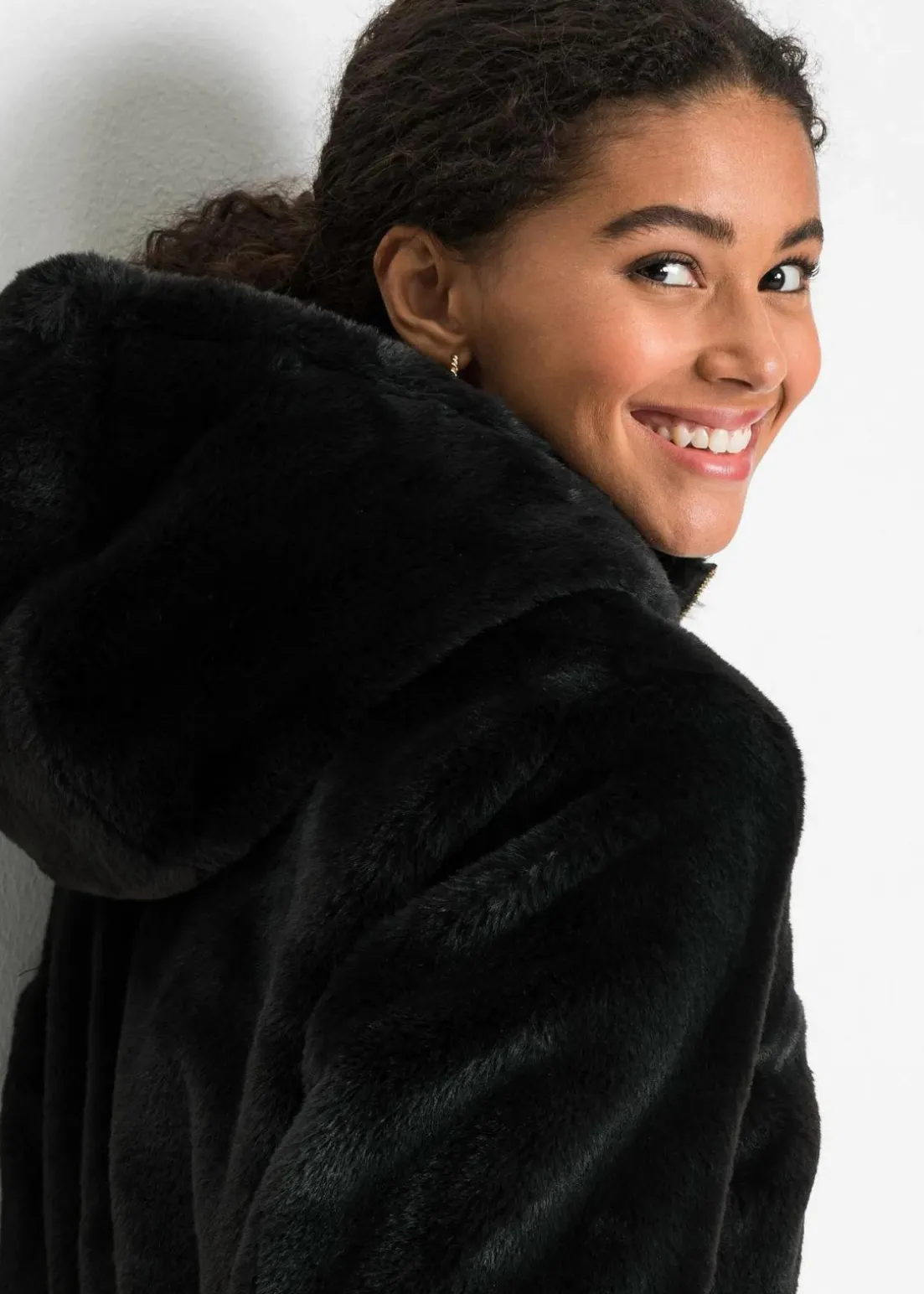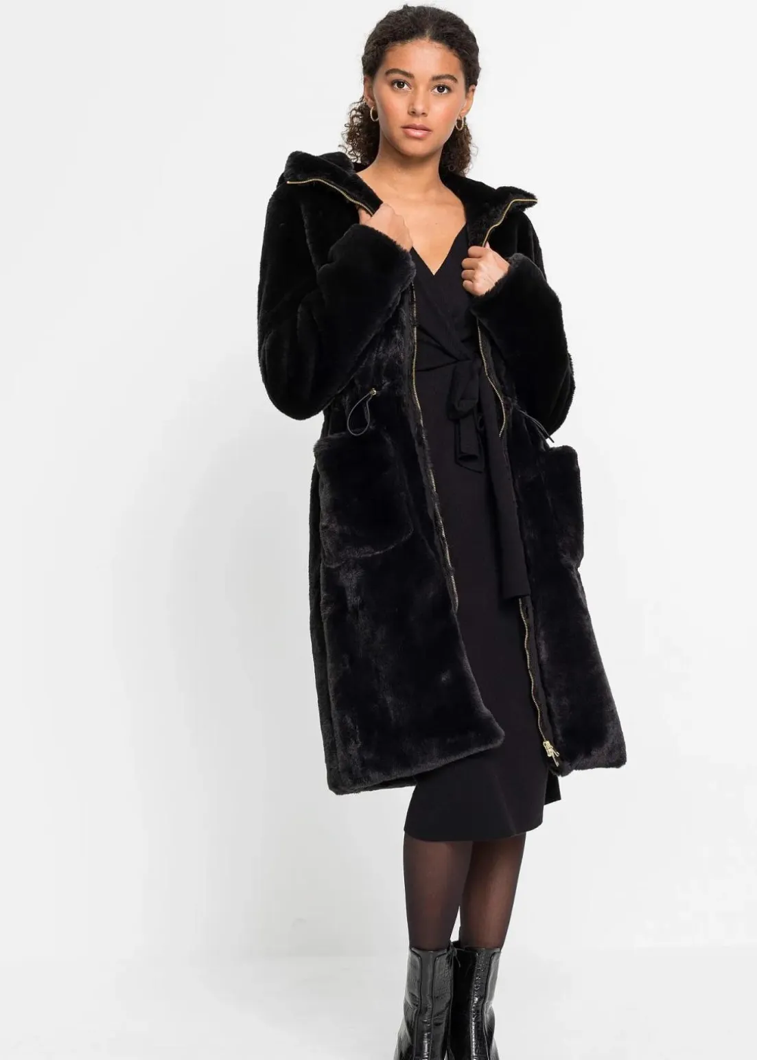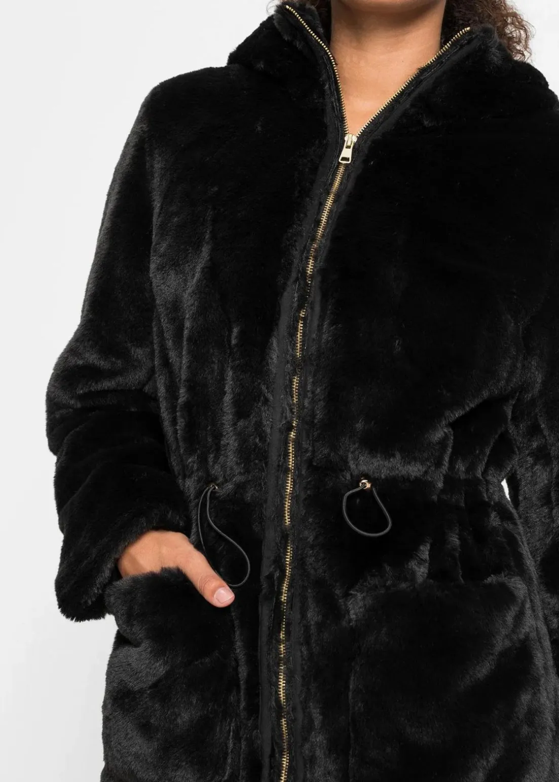 Kuscheliger Wintermantel aus Teddyfell mit großen Taschen und Kaputze