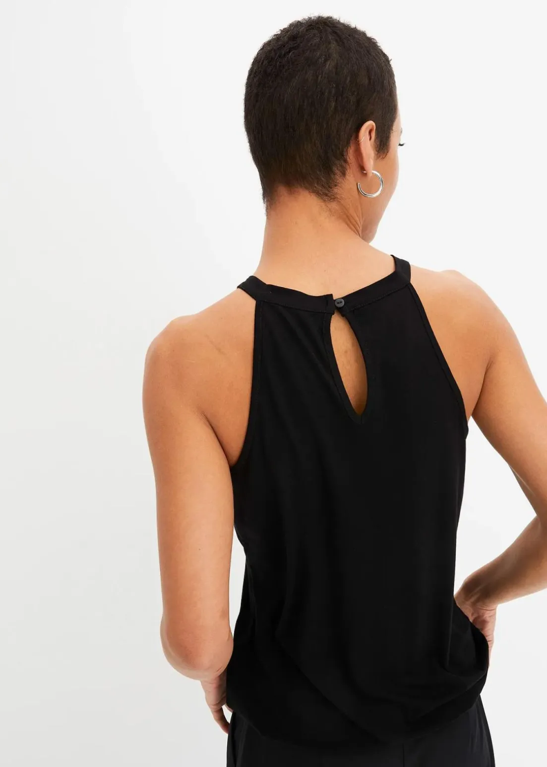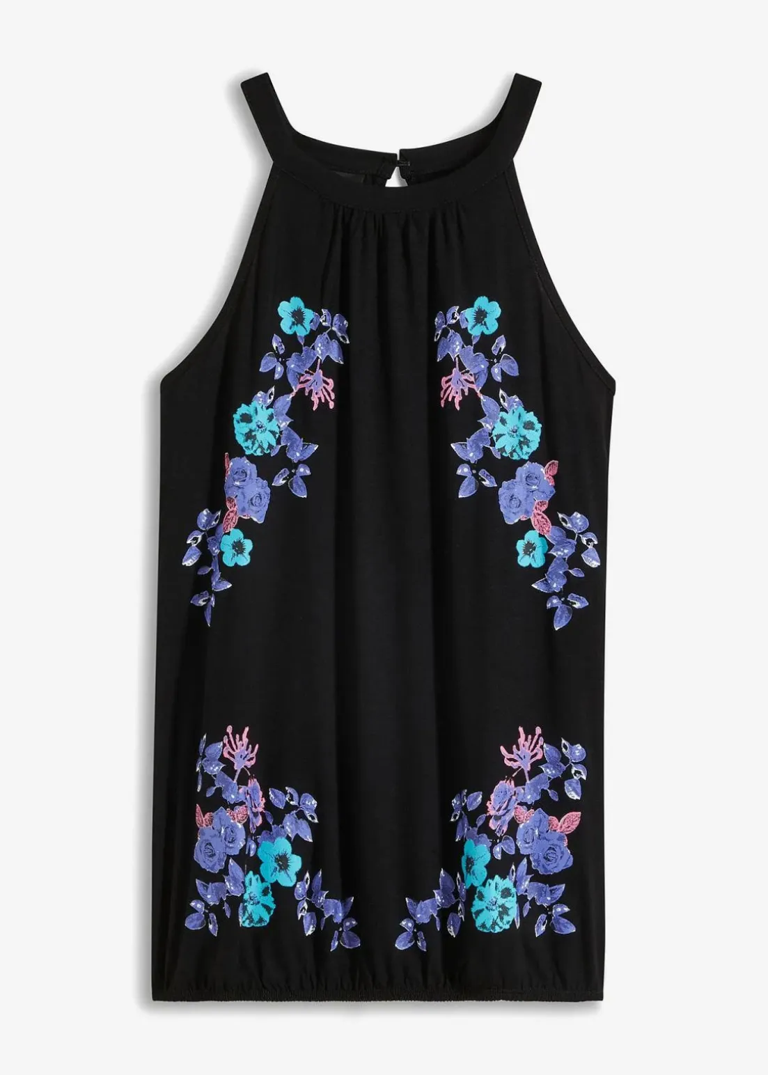 Mit der schönen Raffung am Hausausschnitt und dem Bindeband zum Schließen im Nacken wirkt das Top besonders feminin und verspielt. Der Blumendruck an den Seiten und der Schlitz am Rücken setzen attraktive Akzente.Dank des breiten, elastischen Saums fällt das Shirttop der Marke BODYFLIRT weich die Figur umschmeichelnd. Es passt besonders gut zu schmalen Hosen oder körpernah geschnittenen Röcken.