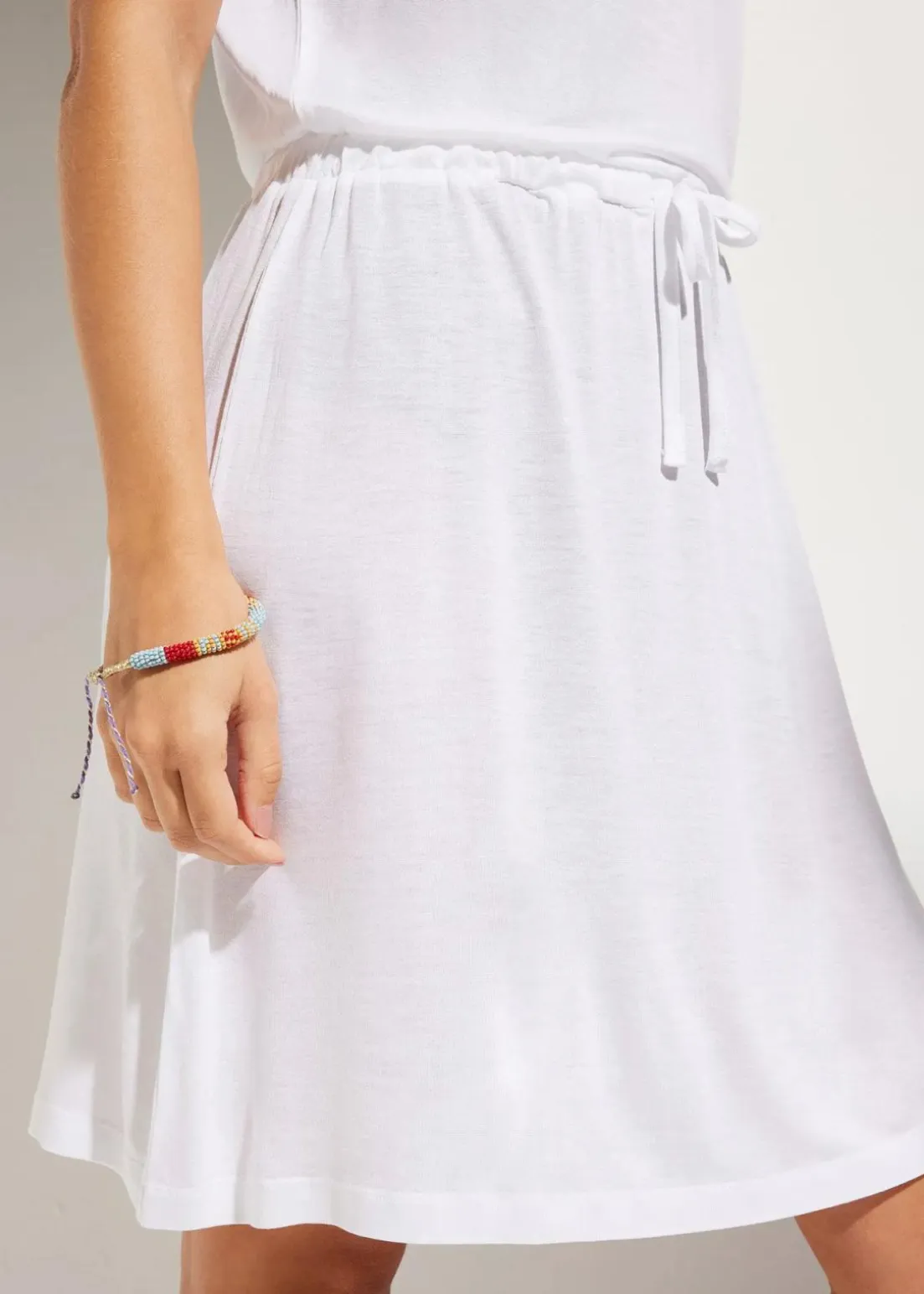Leicht transparentes Strandkleid mit Gummizug und Bindeband in der Taille.