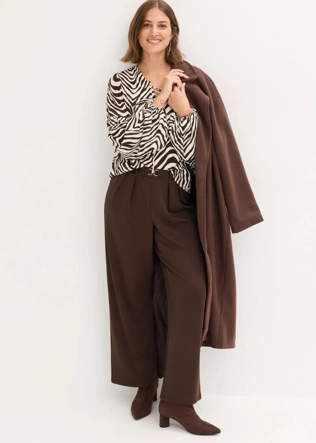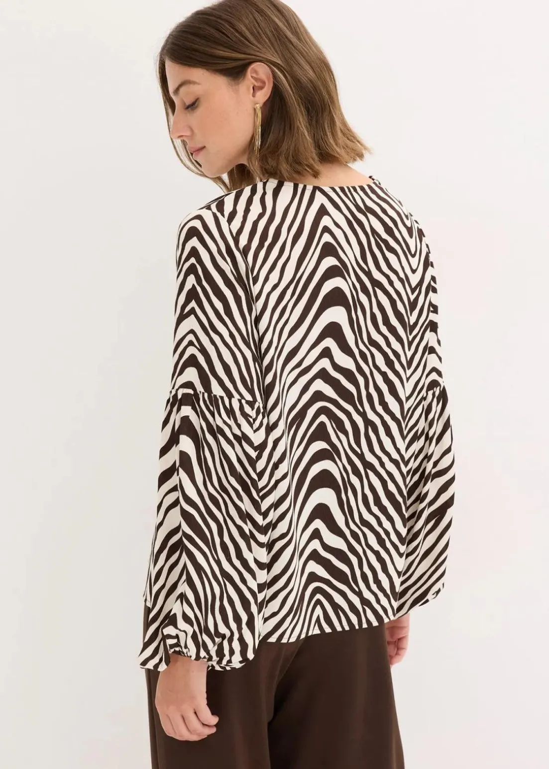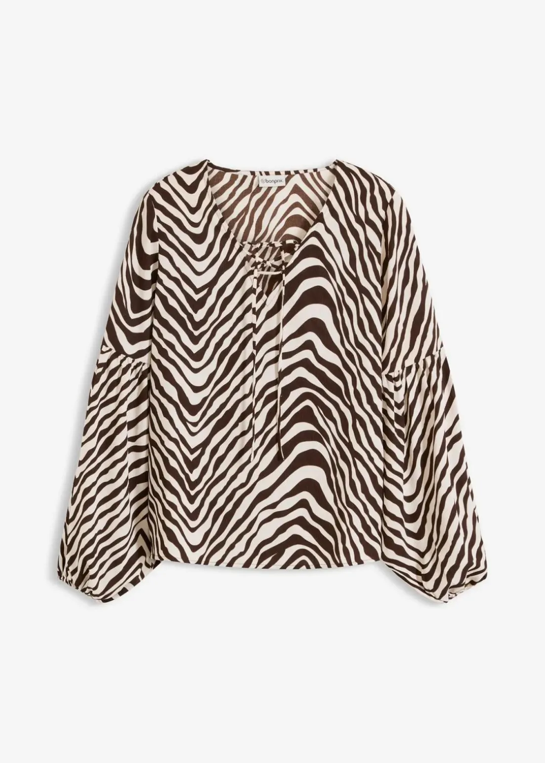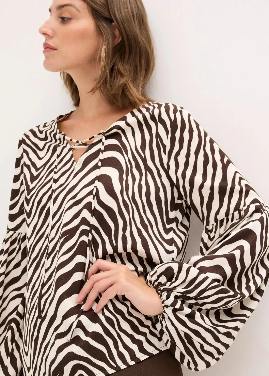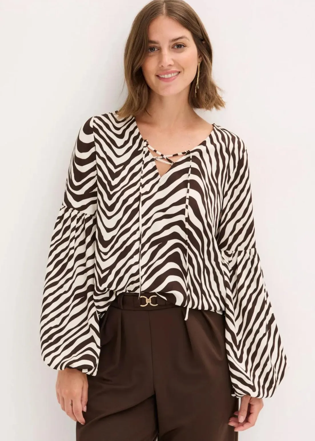 modisch bedruckte Tunikabluse mit voluminösen Ärmeln und Bindeband-Detail vorne am V-Ausschnitt.