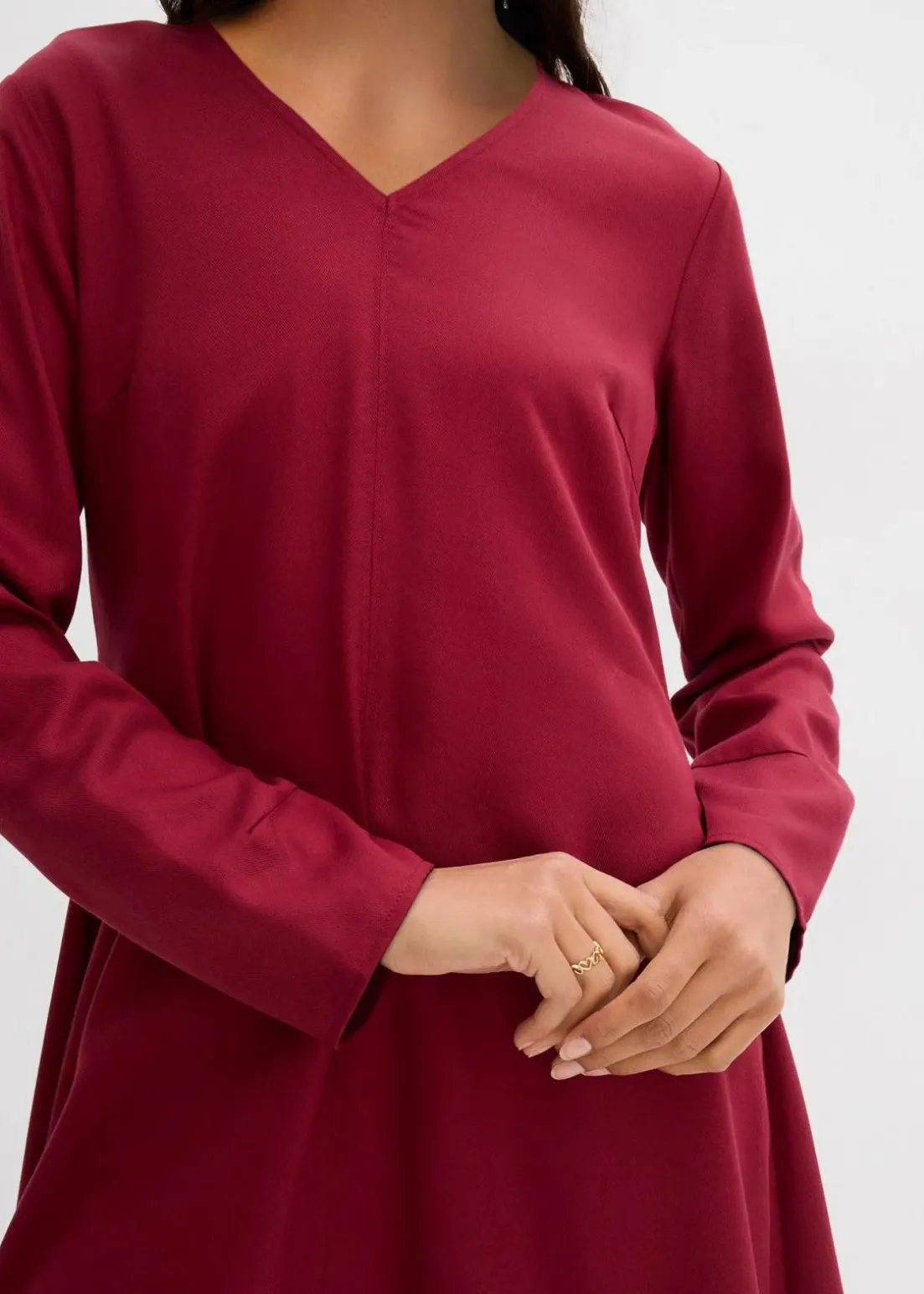 Halblanges, ausgestelltes Kleid mit Abnähern an den Ärmelabschlüssen sowie Ziernaht an Vorder- und Rückseite. Verdeckter Reißverschluss hinten.