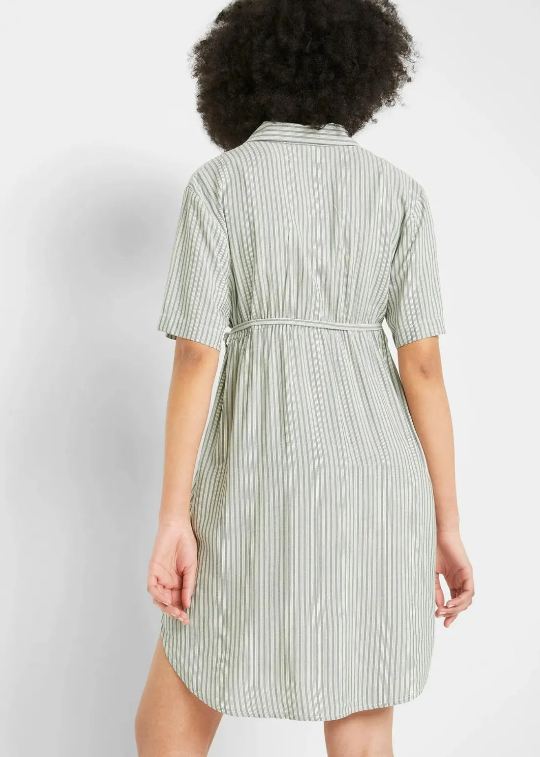 Umstands- und Still-Blusenkleid mit Hemdkragen aus einem fließenden Webstoff. Die verdeckte Knopfleiste ermöglicht ein einfaches Stillen und ein bequemes An- und Ausziehen. Die Unterbrustnaht ist mit einem schmalen elastischen Gummiband versehen. Zusätzlich lässt sich die Weite durch ein abnehmbares Bindeband regulieren.