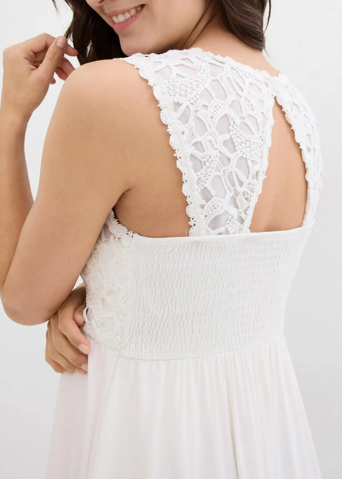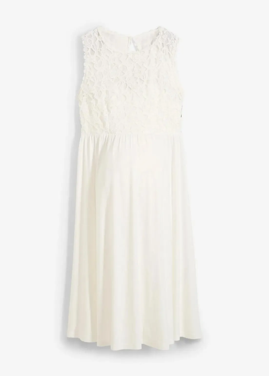 Umstandskleid aus Viskose mit etwas Stretch für ein angenehmes Tragegefühl, verziert mit elastischer Spitze am Oberteil und breiten Spitzenträgern am Rücken, die mit einem Knopf geschlossen werden. Der untere Rücken ist mit elastischem Smock ausgestattet, der für eine flexible Passform sorgt. Der Rock ist in einer leichten A-Linie geschnitten und schafft eine schmeichelhafte Silhouette.