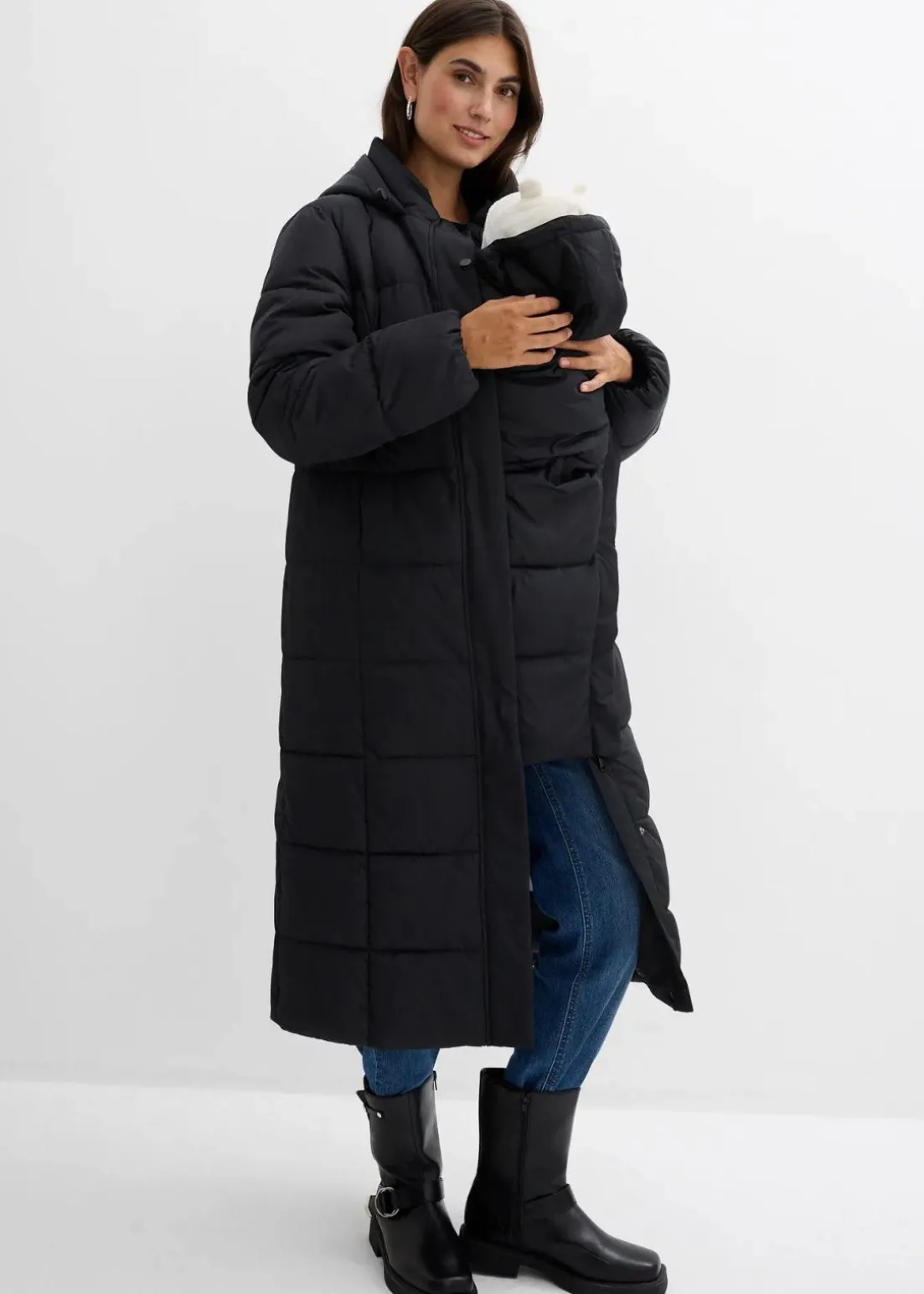 Dieser warm wattierte Mantel in bequemer Oversize-Passform für die Schwangerschaft und Tragezeit. Eingriffstaschen bieten Platz für wichtige Kleinigkeiten im Alltag. Der Trageeinsatz ist so gestaltet, dass er den Hals der Mutter angenehm wärmt, und verfügt über verdeckte Druckknöpfe sowie eine Babykapuze mit verstellbarem Kordelzug. Eine extra große Kapuze für die Mutter schützt zuverlässig bei Wind und Wetter. Ein praktischer Zwei-Wege-Reißverschluss sorgt für mehr Bewegungsfreiheit, während elastische Bündchen an den Ärmeln Kälte und Wind zuverlässig abhalten.
