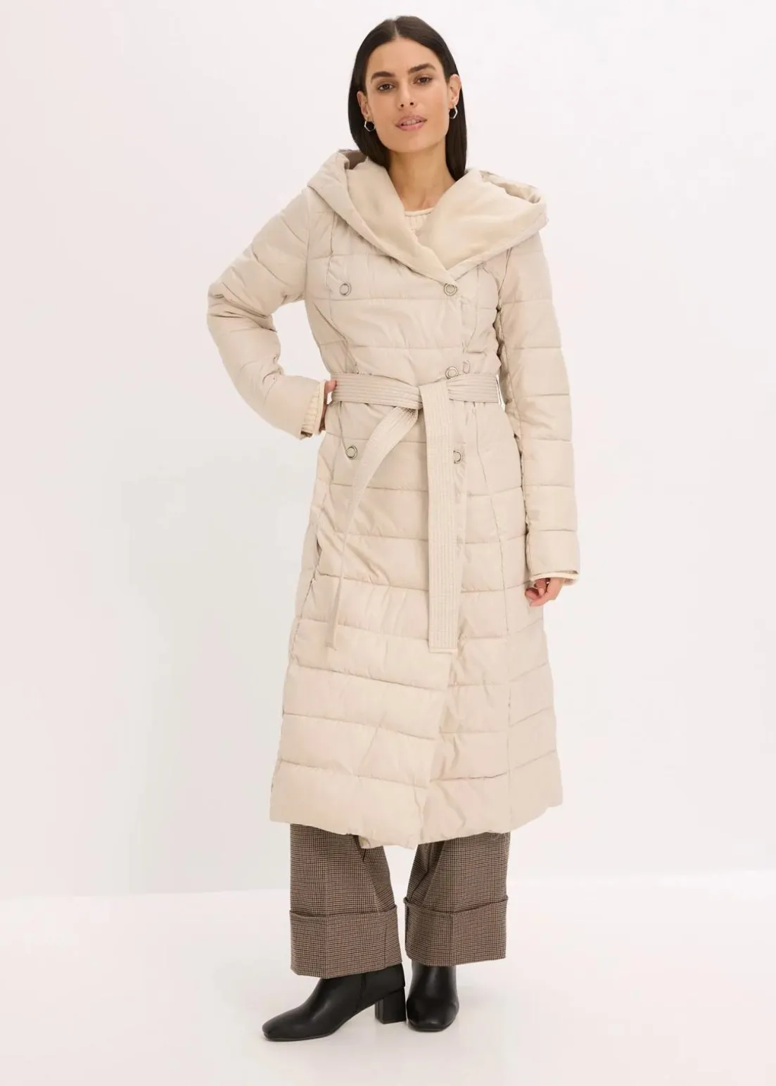 schöner Steppmantel mit Wollimitat Besatz und Bindegürtel (2-tlg.)