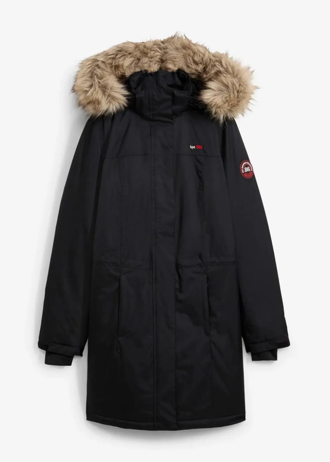 abnehmbare Kapuze und Fell, Daumenlöcher, Innentasche mit Kabelführung, 2-Wege-Reißverschluss mit Kinnschutz, Wassersäule 3000mm, Länge in Gr. 42 ca. 90 cm.
