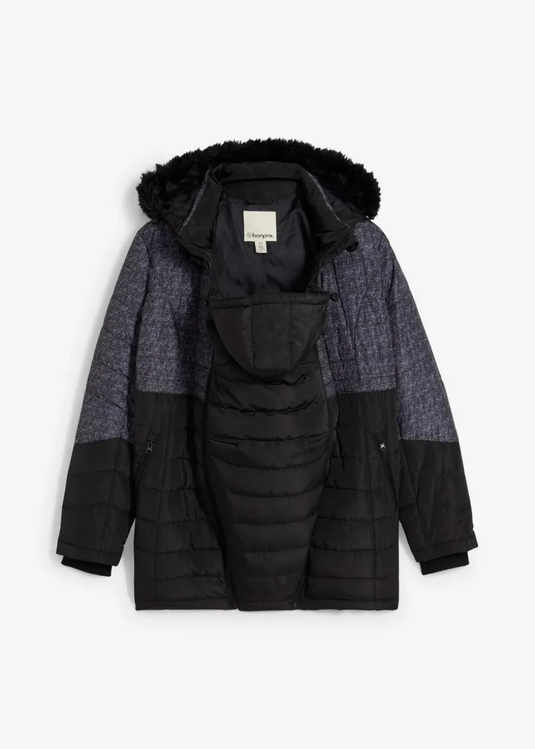 Regen- und windabweisende Steppjacke mit einem Trageeinsatz für das Baby. Mit seitlichen Reißverschlüssen zur Regulierung der Weite, die das Tragen sowohl in als auch nach der Schwangerschaft ermöglichen. Weiche Rippbündchen an den Ärmeln verhindern das Eindringen von Kälte und Wind. Mit praktischen Zippertaschen vorne. Die Kapuze ist abnehmbar und hat einen Kunst- Fellbesatz.