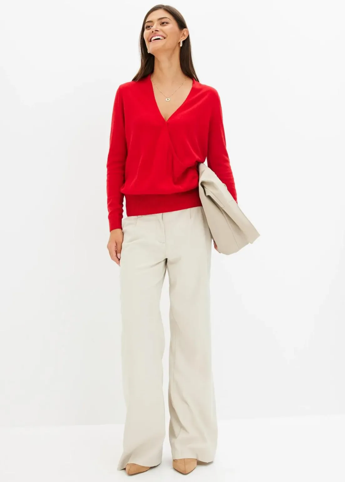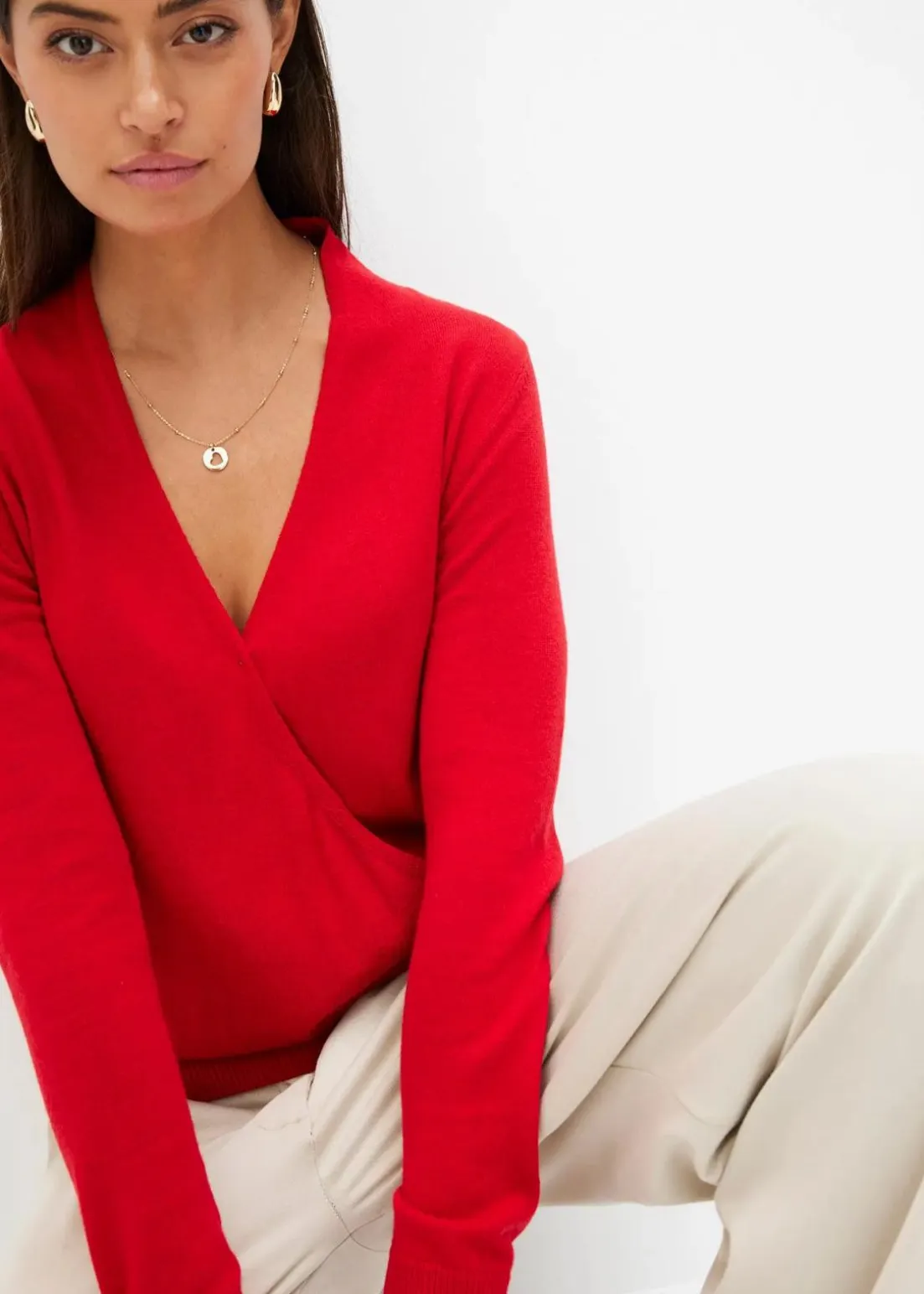 Figurschmeichelnder Wickel-Pullover mit breitem Bund am Saum.