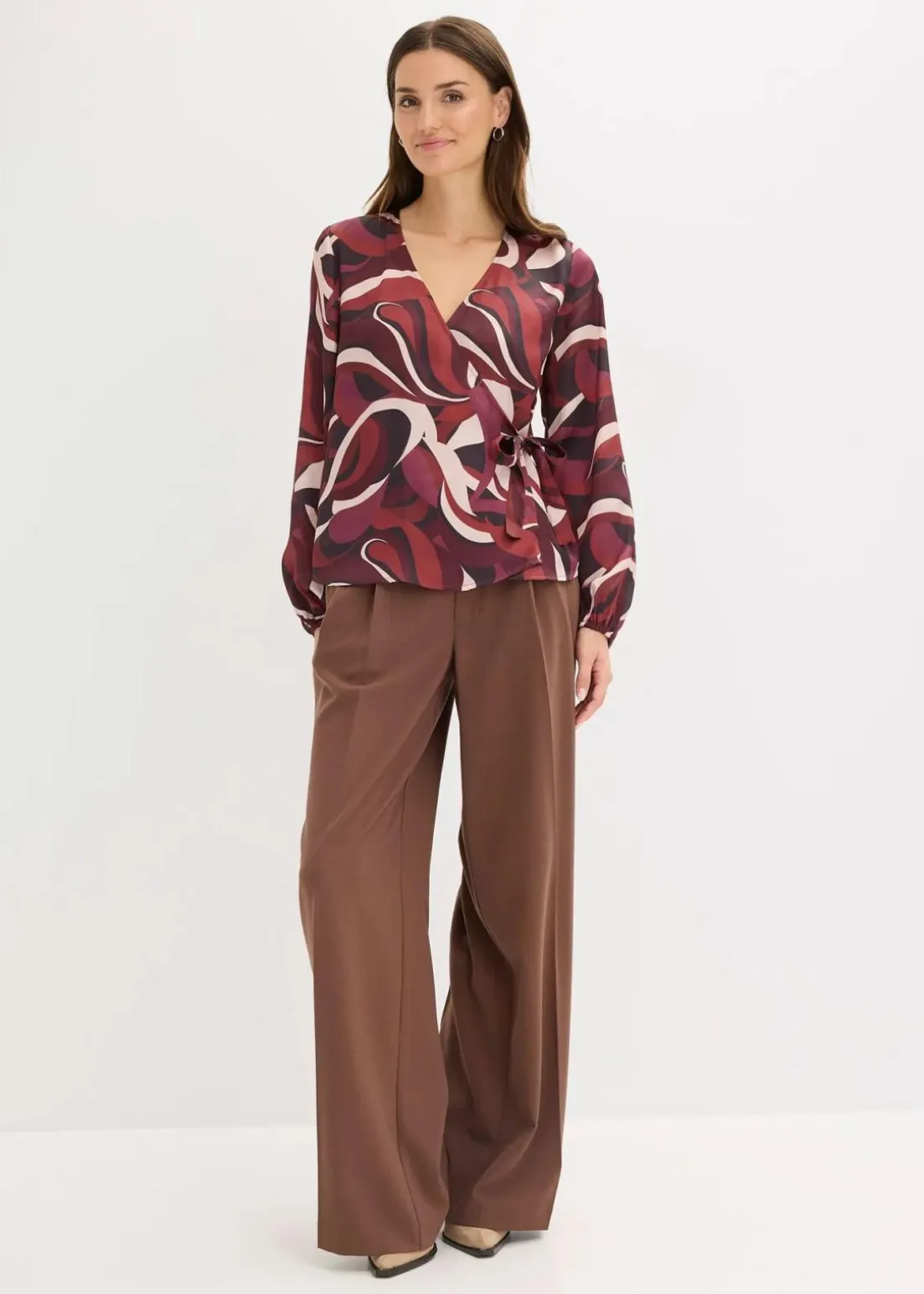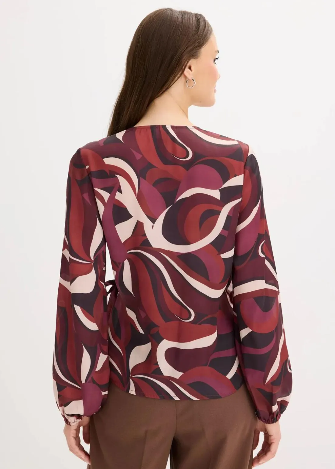 modisch bedruckte Wickelbluse aus fließendem Satin mit Bindeband-Verschluss innen und außen